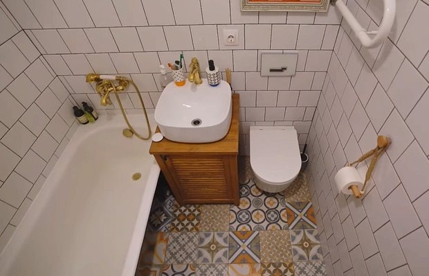 Яркий дизайн санузла своими силами Наша героиня Кристина Лихачева сделала ремонт в своей однокомнатной квартире 38 м² в новостройке без дизайнера. Оформление ванной комнаты она продумала до мелочей — ей хотелось, чтобы это помещение напоминало солнечную яркую комнату, в которой приятно начинать новый день. Отделка стен выполнена в стиле советских интерьеров, когда часть стены покрывали квадратной плиткой, а часть окрашивали. На фоне простой белой плитки эффектно смотрится золотая сантехника. Она добавляет ярких солнечных красок в закрытое узкое пространство. На полу — испанская узорчатая плитка в насыщенных жизнерадостных оттенках. Портрет южной женщины и экзотическое растение добавляют летнего колорита. Позитивную атмосферу вечного лета поддержали винтажной люстрой с золотым каркасом и хрустальными подвесками. Чугунная ванна от застройщика отлично вписалась в ретроконцепцию всего интерьера. Поэтому ее не стали менять и закрывать экраном. Хозяйка квартиры не хотела загромождать маленьк