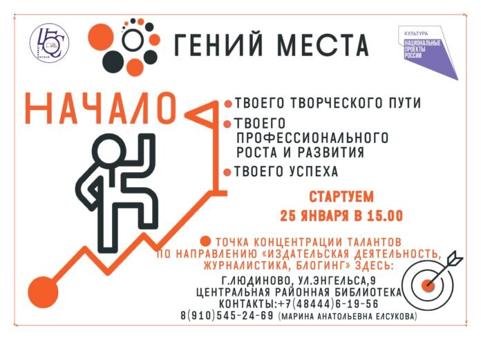Людиновская центральная районная библиотека приглашает учащихся 7-11 классов людиновских школ, студентов техникума, а также жителей нашего города, кому интересно креативное направление «Издательская деятельность, журналистика, блогинг», стать амбассадорами интереснейшего проекта Министерства культуры России «Гений места». Желающие открыть в себе гения могут позвонить в центральную районную библиотеку куратору проекта Марине Анатольевне Елсуковой по номерам, указанным в объявлении и записаться на занятия творческой лаборатории «Академия слова». ТОЧКА – ЭТО НАЧАЛО! Рядом с опытными наставниками и экспертами вы научитесь: — лаконично и содержательно выражать свои мысли; — создавать и редактировать тексты; — писать пресс-релизы, тематические и аналитические материалы; — особенностям журналистской работы; — навыкам написания содержательных постов в социальных сетях; — проводить интервью, фотосъемку; — основам издательской деятельности, в т.ч. верстке газеты. Вас ждут мастер-классы: — по пр