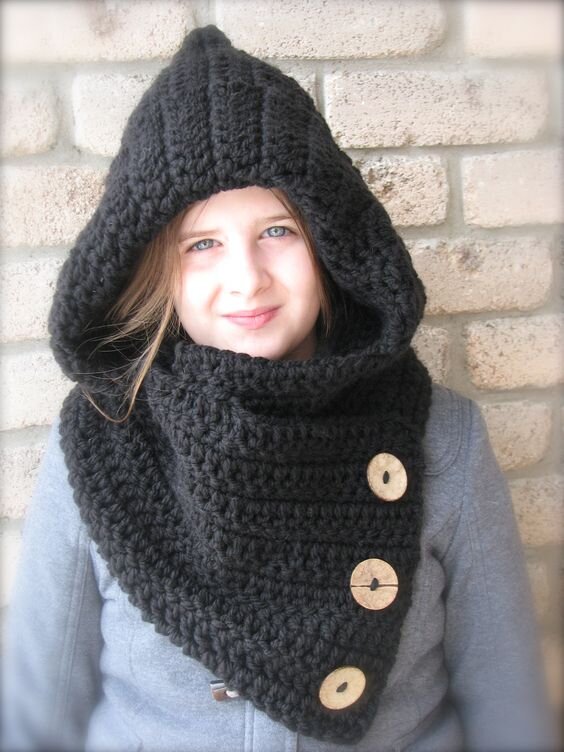 Всем большой привет. Я сейчас вяжу капюшон... а вот дальше встал вопрос - Капюшон-снуд или Капюшон-шарф. И вот у снуда, как мне кажется, есть недостатки: 1. Если это снуд, надо хорошенько рассчитать, какова длина этого кольцевого шарфа, чтобы красиво выглядел, был достаточно пышным, теплым и прилегающим, но не давил шею. 2. Его же надевать и перекручивать через голову, а это достаточно неудобно и плохо отражается как на прическе, так и на макияже). И скорее всего я за капюшон-шарф. Или капор+шарф. Или даже снуд, но на застежке - пуговицах, например. И тут можно красиво обыграть и застежку и сами пуговицы, которые станут дополнительным украшением. А ещё шарф можно сделать длинным, с кистями, и его можно надеть очень даже по разному. А вам что больше нравится? Позже покажу свое произведение. Оно в работе. А сейчас варианты из сети. С пуговицами. Хочу сказать, что вязка сдесь в основном простая - платочная или крючком столбиками с накилами или без. Я все таки люблю, чтобы б