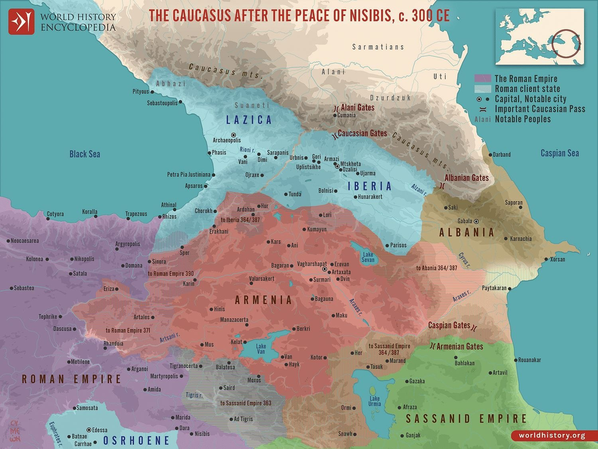 Карта, иллюстрирующая кавказские государства в 299 году нашей эры, изображает период геополитической стабильности и четко определенных границ между Римской и Сасанидской империями.