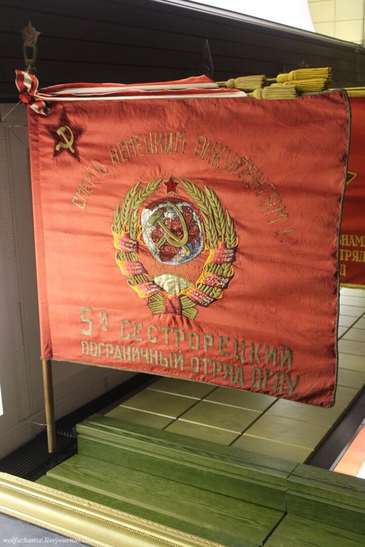 В Центральном пограничном музее есть вот такое очень интересное знамя. Сперва обращаю внимание на герб и надпись внизу знамени - шесть ленточек на гербе и погранотряд ОГПУ. Т.е. знамя вручено до 1934 г., ликвидации ОГПУ.