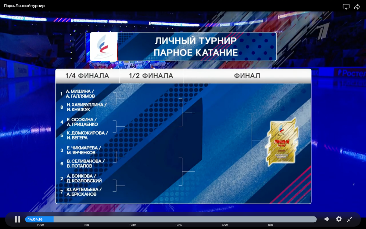 Личный турнир открывают пары. Соперников определила квалификация. В первом туре пара, занявшая первое место, выступит против последней. Вторая - против предпоследней. И так далее. По-моему, это вполне справделиво, так как в финале по логике сойдутся сильнейшие. 1/4 На первом этапе им надо выполнить 3 элемента: подкрут, выброс и прыжок. На каждый из них есть всего 1 попытка, но если пара выполняет элемент в 4 оборота, то ей добавят 15 секунд, и она может сделать именно этот элемент ещё раз, если захочет. Мишина и Галлямов - Хабибуллина и Княжук Настя с Сашей 3S - чисто и параллельно 3Tw4 - тройная подкрутка на четвёртый уровень чисто 3FTh - выброс-флип чисто Баллы: 21.62 Наташа и Илья 3Tw3 - чисто 3Lz - с ошибкой у партнёрши 3LzTh - выброс чисто Баллы: 17.76 Осокина и Грицаенко - Доможирова и Вегера Лиза и Артём 3T - чисто 3Tw4 - тройная подкрутка четвёртого уровня чисто 3FTh - выброс чистый Баллы: 20.59 Кира и Илья 3Tw4 - чисто 3S - с ошибкой у партнёра 3LoTh - чисто Баллы: 18.07 Чикм
