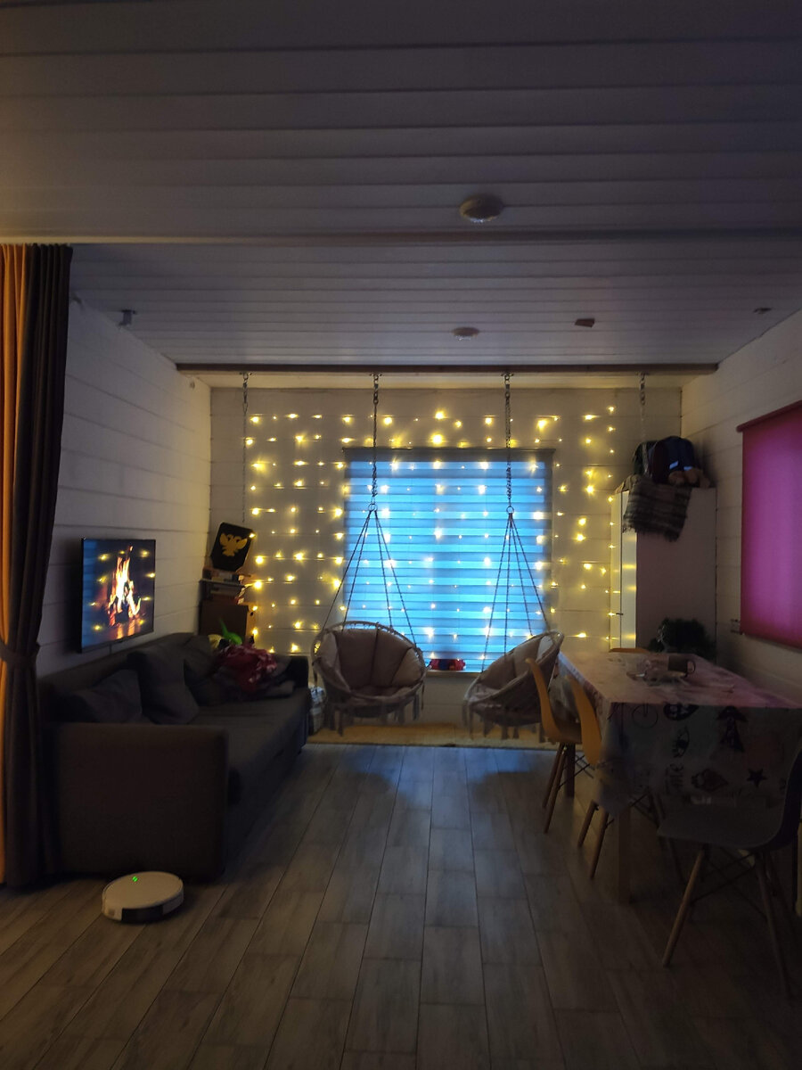 Написала в декабре статью про новогодние украшения в гостиной, а в итоге скатилась к обсуждению планов на ремонт 🤣 Исправлюсь! К новогоднему торжеству гостиная выглядела так: Главное, что мы успели повесить кресла и гирлянду. А то еще за неделю до праздника вид у комнаты был совсем грустный: К сожалению, не успели убрать шкаф и украсить елку гирляндой. Все-таки «огоньки» — основа праздничного декора. В середине января телевизор вернулся к законному владельцу, а у нас появился новый гаджет для просмотра вечерних мультиков: Гирлянды решили не снимать: они добавляют +100 баллов к вечернему уюту. А вот одна из гирлянд на улице, к сожалению, перестала работать. Причину пока не знаем. Нас капитально засыпало снегом — придётся ждать весны, чтобы проверить провода. *** Внимательный читатель, возможно, заметил еще ряд перемен. Елку за январь я переставляла целых 4 раза, и везде она мешалась! Последний вариант оказался самым удачным, но я психанула и уже разобрала ее. На комоде снова кофей