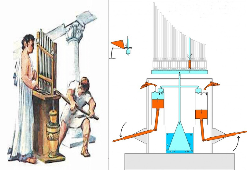 Прежде чем рассказать что-нибудь интересное про фортепиано, необходимо сделать одну остановку. И подробнее рассмотреть водяной орган - гидравлос. Это музыкально-техническое чудо инженерной мысли! И только попробуйте сказать что вы про него знали. Гидравлос в дословном переводе: гидра - вода; авлос - авлос (древнегреческий духовой музыкальный инструмент). Как мы помним, изобрёл его Ктесибий (грек). Его же считают отцом пневматики. Ктесибий изобрёл поршневой насос, камнеметатель (который работал на сжатом воздухе) и водяные часы - клепсидры (они были самыми точными до XVII века). Жил этот грек в 284-221 год до н. э. Но вернёмся к гидравлосу. Его принцип работы такой: