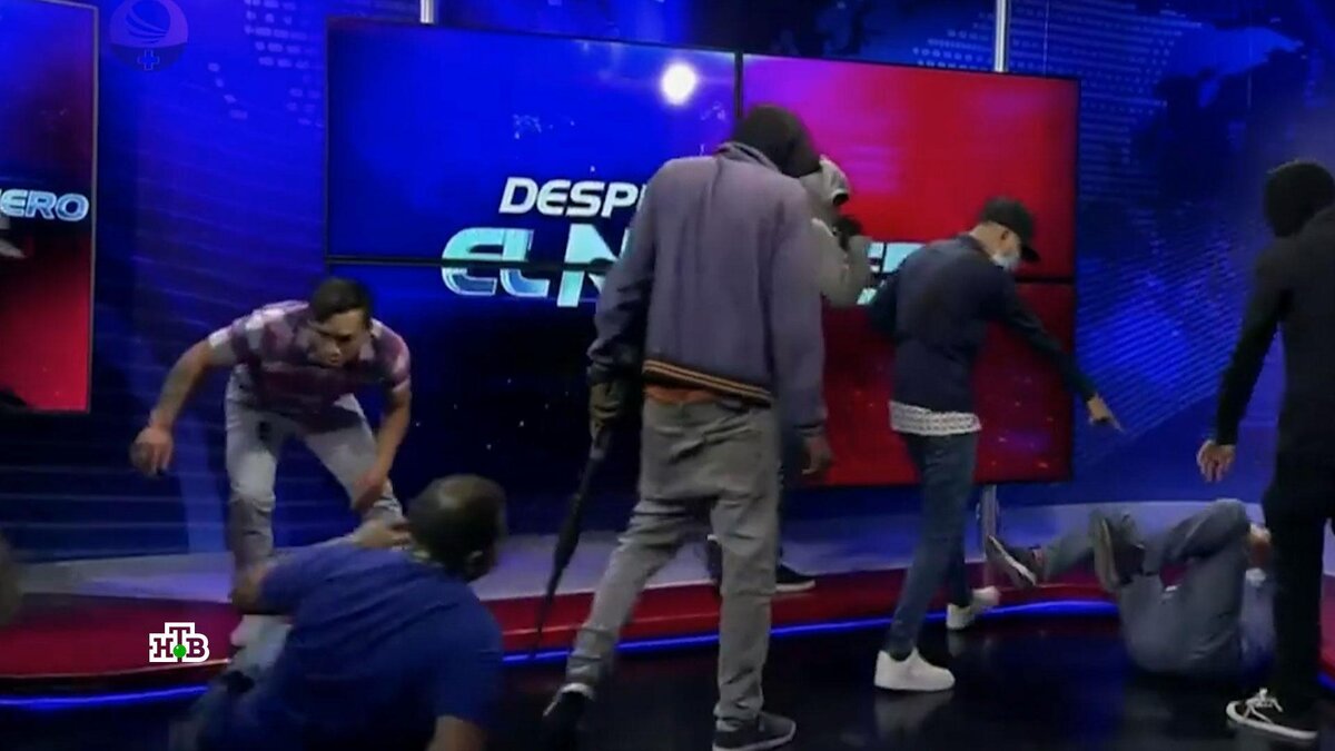 [ Смотреть видео на сайте НТВ ] 2024 год начался стремительно и многообещающе тревожно. В Эквадоре власть едва не захватили сбежавшие из тюрьмы зэки. Мятеж мафии мир увидел практически в прямом эфире — первым делом сбежавшие из тюрьмы преступники захватили телестудию. Ведущему новостей Хосе Луису Кальдерону пришлось вести репортаж с динамитной шашкой, которую в карман его пиджака засунул террорист. После освобождения Хосе дал интервью репортеру «Центрального телевидения» Антону Чечулинскому и рассказал, каким был этот самый длинный и страшный день в его жизни. Эти кадры облетели весь мир. Люди, вооруженные дробовиками, пистолетами и мачете в прямом эфире взяли в заложники сотрудников эквадорского телеканала TC Television в городе Гуаякиль. Переговоры с террористами пытался вести один из ведущих телеканала Хосе Луис Кальдерон. Пока он уговаривал пощадить коллег, один из налетчиков вставил ему в карман пиджака динамит. Хосе Луис Кальдерон, журналист: «Они пришли, чтобы показать, что они