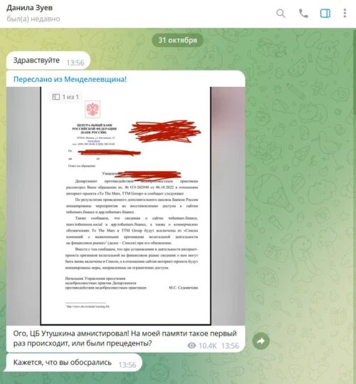 Сначала я не мог поверить, что письмо о разблокировке ресурсов компании может быть правдой. И прежде всего, я написал своим контактам в ЦБ, проверить действительно ли это письмо подлинное. И, к моему удивлению, да. Это реально так. Мол "To The Mars" и "TTM Group" сменили сферу деятельности чисто на обучение и к финансам теперь отношения не имеют. Прискорбно, но именно так и работает бюрократия.