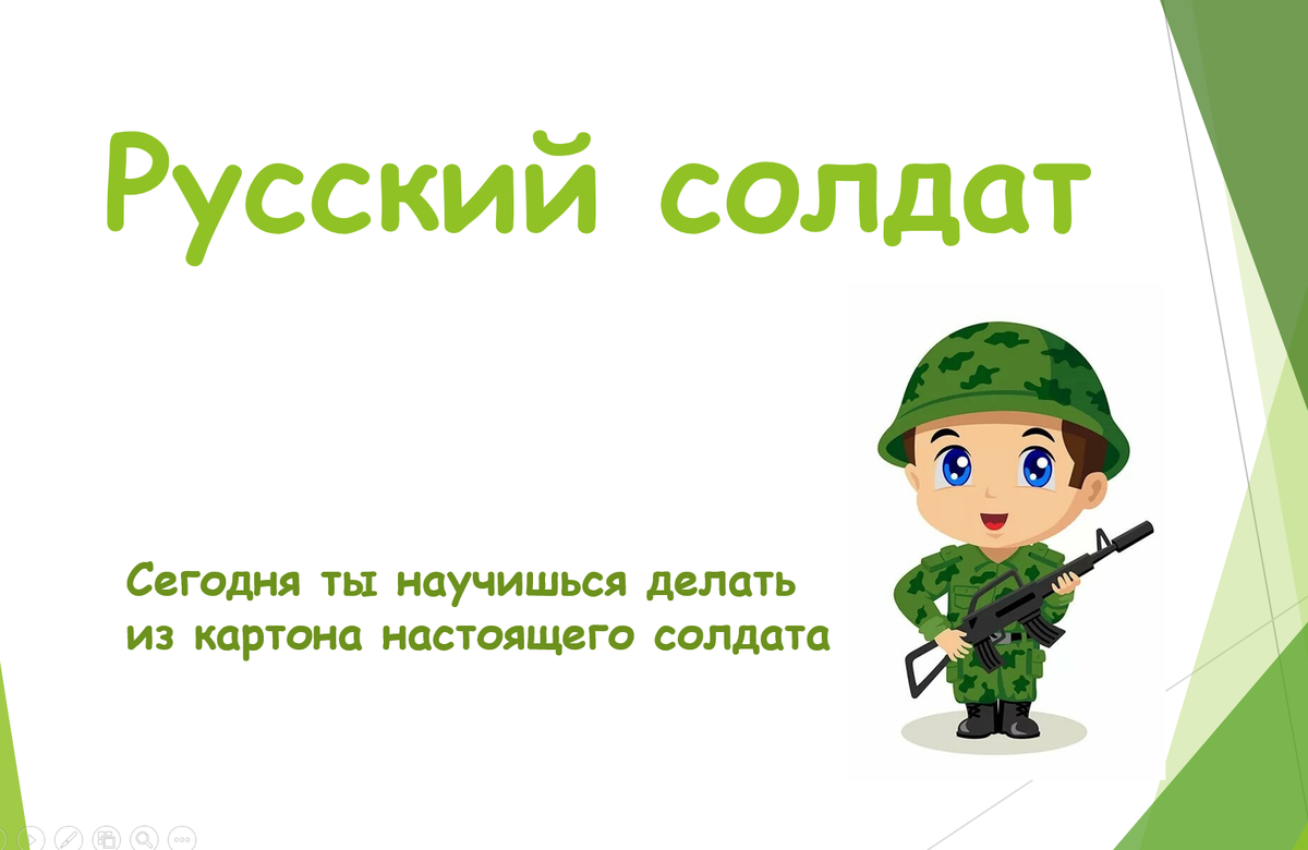 Маленькое задание ко Дню Защитника Отечества. Задание выполнялось в ковидные времена в форме презентации на дистанционном уроке, поэтому у фоток такой "мультяшный" вид. Может кому пригодится. На самом деле, цель у этого задания не просто сделать солдата и подарить папе, дяде, дедушке... Вы наверняка заметили, что дети на своих рисунках руки-ноги делают прямыми, без локтей и коленок. И это нормально. Это второстепенная деталь, которая обычно не меняет смысла нарисованного. Но тогда, когда нужно, чтобы нарисованный человек согнул руку или ногу - возникает проблемка. Итак, прежде, чем начинать делать нашего солдата, предложите детям походить не сгибая ног и совершить несложные действия - схватить себя за нос, погладить по голове... не сгибая рук. Это упражнение вызовет смех, по комнате будет ходить строй "роботов" с растопыренными руками. Неудобно? Конечно неудобно! А чтобы было удобно, у людей есть локти и коленки. Мало того, даже ладошка и ступня сгибаются. Пробуем ходить сгибая ноги