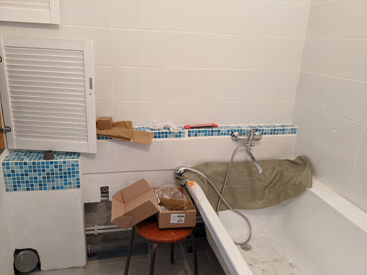 Итак, продолжим про ремонт. Для тех кто пропустил или не читал ниже ссылка на предыдущую статью. В санузле мы наконец-то установили смеситель над ванной. Не для примерки как раньше, а по-настоящему, с проверкой герметичности всех соединений. Вот уже и ванна стала похожа на ванну, и появилась проточная вода. Теперь чтобы помыть руки или инструменты не надо бегать к маме в соседнюю квартиру. Параллельно с этим дошпатлевали стыки гипсокартона и нанесли влагостойкую краску в несколько слоев. Наш сантехнический короб я теперь называю печкой. А что? Похож же! В комментариях писали, что нам нужно было сделать нижнюю часть короба такой же глубины, как и верхнюю, а остальные коммуникации надо было убрать в короб за унитазом. Интересные советы, конечно. Не совсем понятно зачем это делать. В нижней части короба у нас два коллектора на ГВС и ХВС, все подключения, счетчики и даже вводные краны. Спрятав всё это за унитазом, мы бы лишились лёгкого доступа к этому всему. Когда мы жили в съемной квар