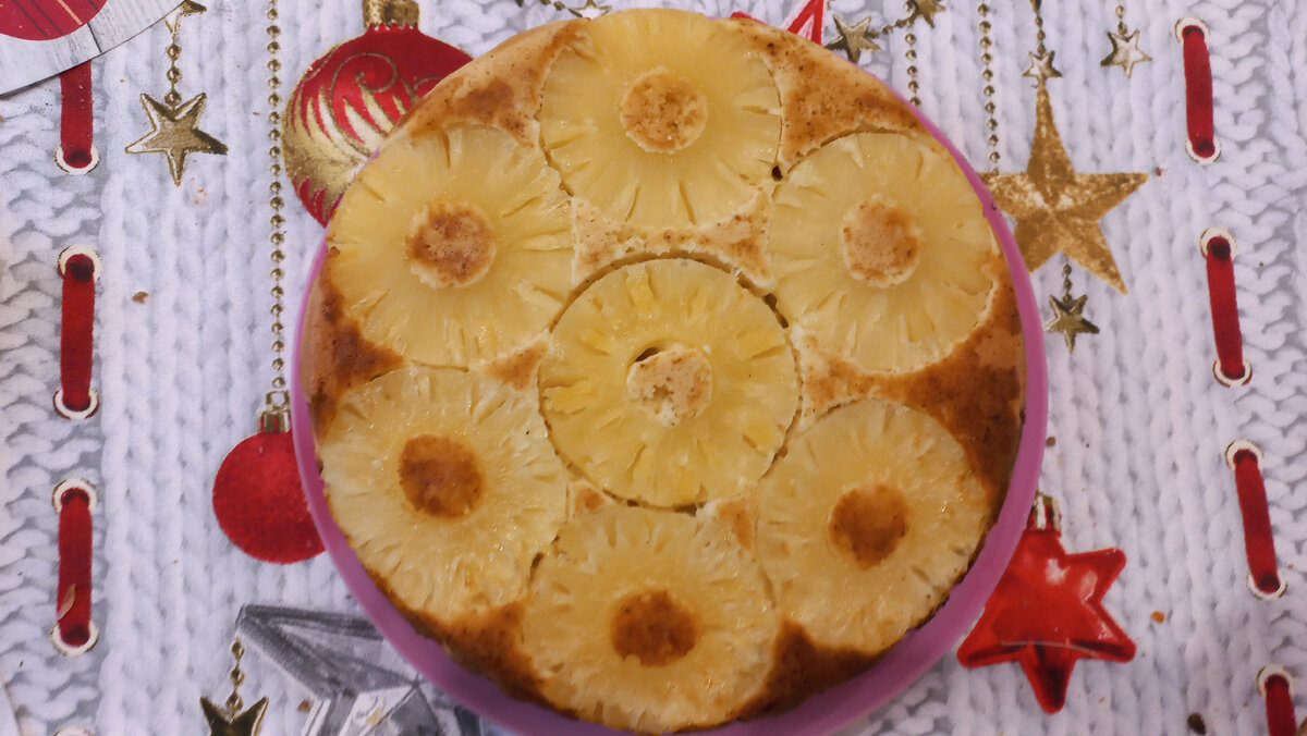 Это вкусный и простой рецепт. Я делаю его в двух вариантах. С ананасами или с мандаринами. Но мне кажется, что подойдёт и банан. Он украсит как праздничный стол так и уютное чаепитие в кругу семьи.