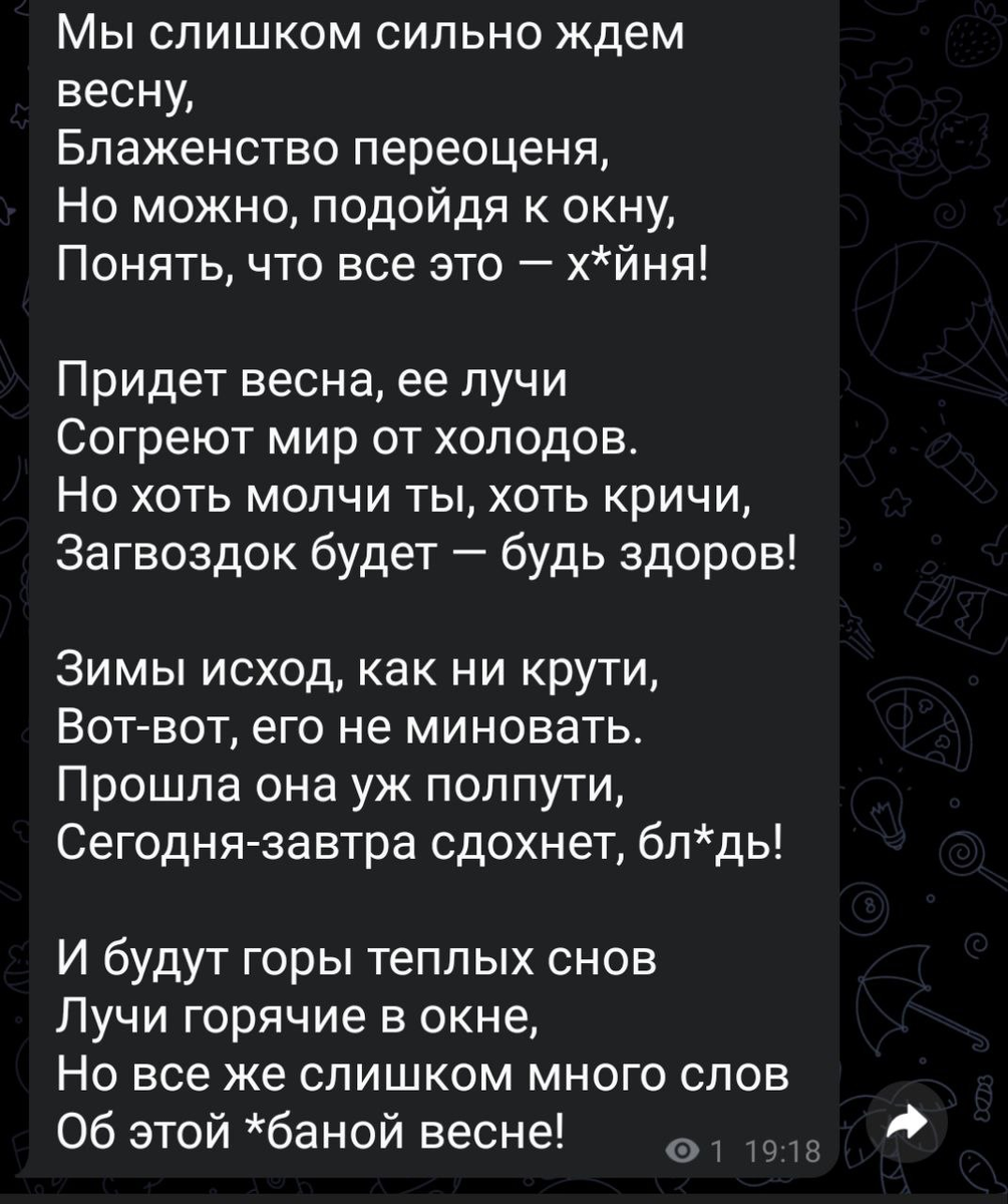 Нет, действительно наши ожидания никогда не соответствует реальности. Вот и сейчас все ожидают весну и ждут от неё какого-то чуда. Увы его не будет. Будет всего лишь на несколько градусов теплее. А это я просто хулиганю. На самом деле я пишу стихи для различных групп вокалистов. Так же поздравительные с днём рождения. Так что, если что обращайтесь, пожалуйста. А ненормативная лексика - дело такое, хулиганское).
