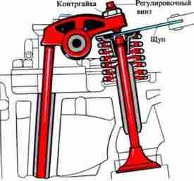 - Берем плоский щуп и просовываем его между стержнем клапана и регулировочным винтом. Для впускного клапана нужен щуп 0,03 мм, для выпускного - 0,05 мм.