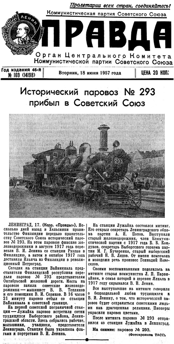 13 июня 1957 года в Хельсинки состоялась торжественная церемония передачи 293-го советской правительственной делегации. На паровозе была табличка с надписью на финском и русском языках: «Финское правительство подарило этот локомотив правительству Союза Советских Социалистических Республик в память тех поездок, которые В. И. Ленин совершил в трудное время по территории Финляндии». 20 июня 1957 года ст. машинист Адольф Данилович Линдстрем привел его в Ленинград.