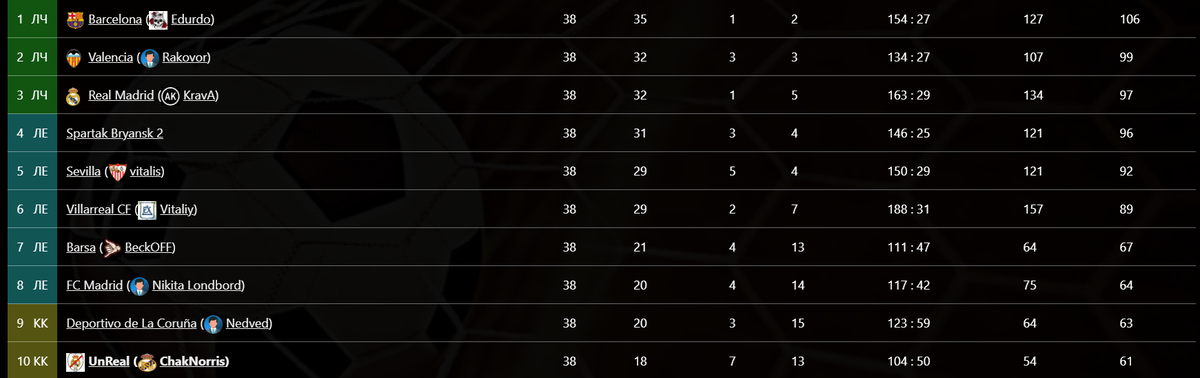 Спартак Брянск 2 (Эспаньол), под бывшим предводительством Мирона (Динамо Киев) смог обойти и Севилью, и Вильярреал, и почти оттеснил Мадридский коллектив от бронзы! Однако клуб был, к сожалению, был переведен в другую лигу.... На его место был переведен из чемпионата России Спартак Брянск под предводительством Андрея (Волга-Ульяновск)!