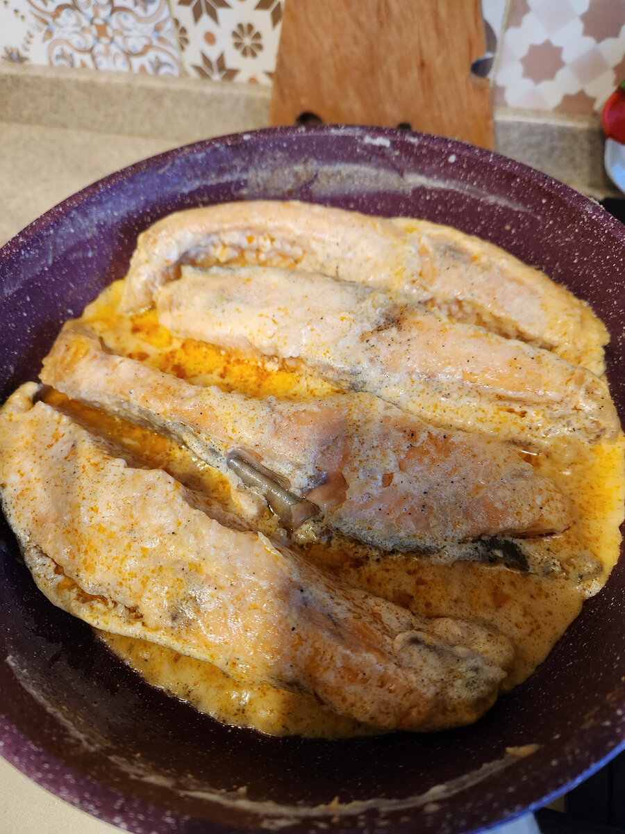 Доброго дня! Попробуйте приготовить семгу в сливках. Обжариваем кусочки семги на растительном масле до золотистой корочки. Вливаем сливки, тушим 5 минут. Добавляем соль, паприку. Я всегда добавляю ложку пасты Том Ям. Она придает остроту, пикантный вкус и приятный цвет сливочному соусу. Приятного аппетита!
