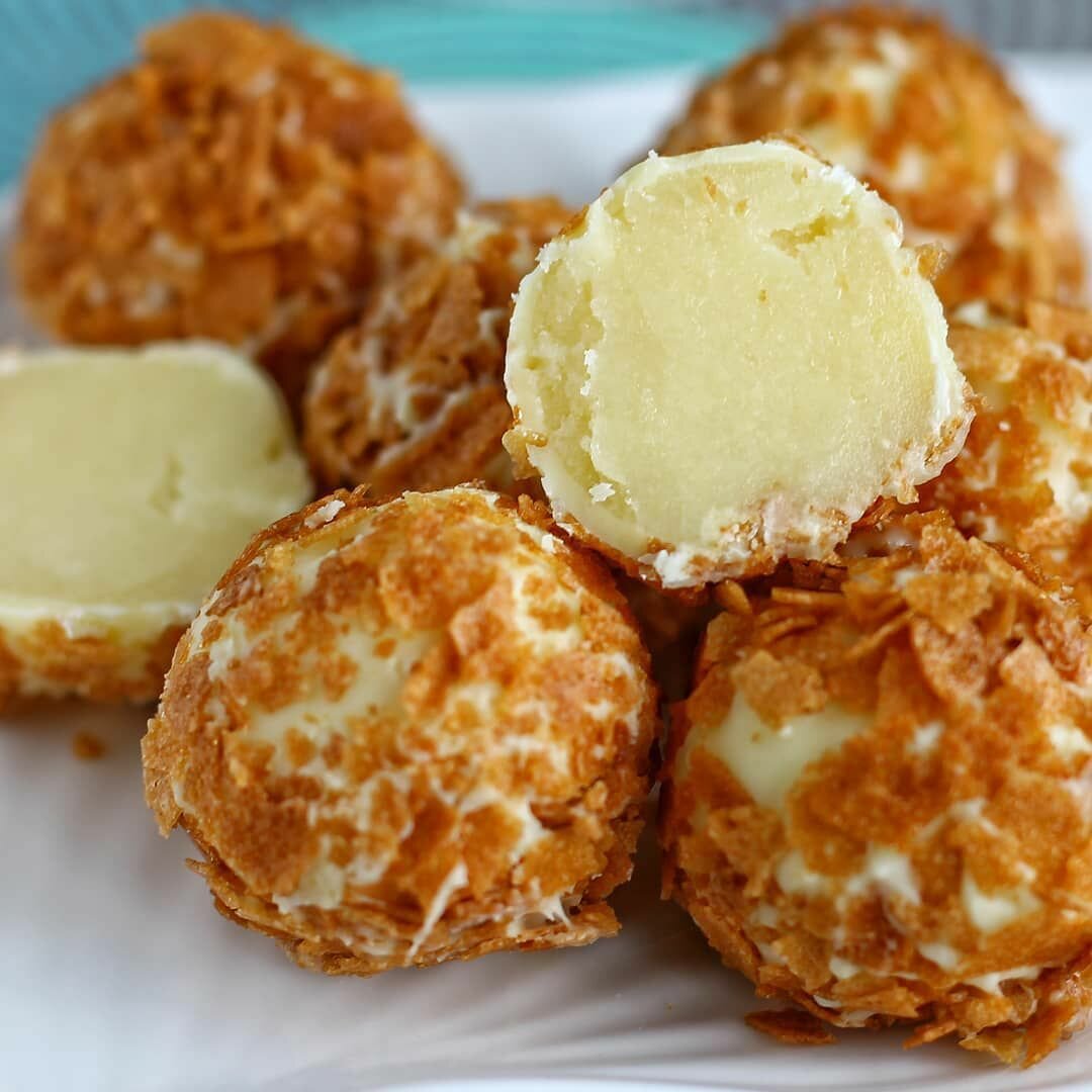 Для конфет: 150 гр белого шоколада 25 гр какао-масла 60 гр сливок 33% 20 гр глюкозы 5 гр ликера/коньяка 100гр сыра бри Около 250гр белого шоколада для создания корпуса Сливки с глюкозой смешиваем и нагреваем до кипения (85°с). В отдельной посуде растапливаем шоколад (аккуратно, не перегрейте и не сожгите), добавьте какао-масло, тщательно перемешайте. Сливки добавьте к шоколаду и хорошенько перемешайте. Добавьте ликер/коньяк, перемешайте. Измельчить сыр кубиками примерно 1*1см, добавить в теплый ганаш, размешать и пробить блендером. Остывший до 26-27°с ганаш выложить в кондитерский мешок, отсадить трюфели по 10-12гр. Оставить стабилизироваться на сутки при 18°с. Скатать руками в шарики. Закрыть в корпус темперированным шоколадом. Если не хотите заливать в корпус, можно попробовать просто обвалять в мелконарубленных орехах или вафельной крошке.