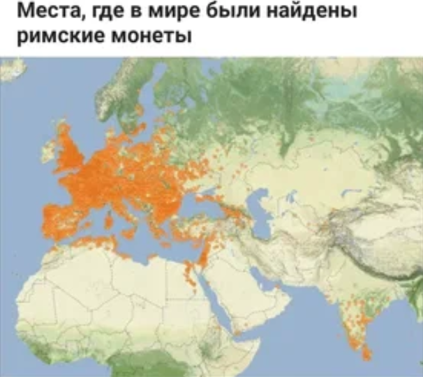 На одном развлекательном ресурсе нашел картинку, которая демонстрирует распространение древнеримских монет по континенту, а вернее - где были найдены древнеримские монеты: Можно приблизить Европу: Будто бы красную икру разбросали. Европа - это понятно. Было бы удивительно, если бы там не нашли монеты Древнего Рима. Но меня заинтересовала "икринка", что прилипла на карту в одном интересном месте: Получается, что монету (или монеты) из того самого Древнего Рима обнаружили где-то под Курганом? Причем это единственный случай в Западной Сибири. Неужели такое возможно? Под древнеримскими (римскими) монетами понимают монеты, которые выпускались во времена существования так называемого Древнего Рима, т.е. примерно до 5 века нашей эры. Территория за Уралом (если смотреть с европейской части страны) начала заселяться лишь похода Ермака. До этого там жили местные народы. Но когда туда могли попасть римские монеты? Непосредственно в начале нашей эры или уже потом кто-то прикопал, а наши совр