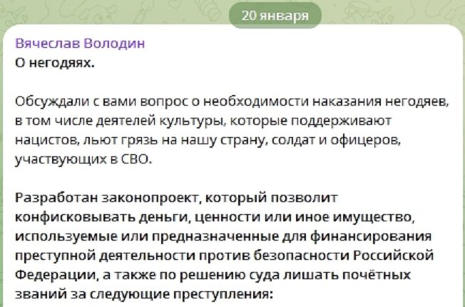 Судя по всему Галкин* и Пугачева все же лишаться своего замка в деревне Грязь и всего остального имеющегося имущества. В понедельник, 22 января, в Госдуму будет внесен законопроект, в случае принятия которого, государство сможет конфисковывать деньги, ценные вещи и прочее имущество, используемое или предназначенное для финансирования деятельности направленной против Российской Федерации. Также предлагается лишь всех имеющихся званий сбежавших и дискредитировавших себя артистов.