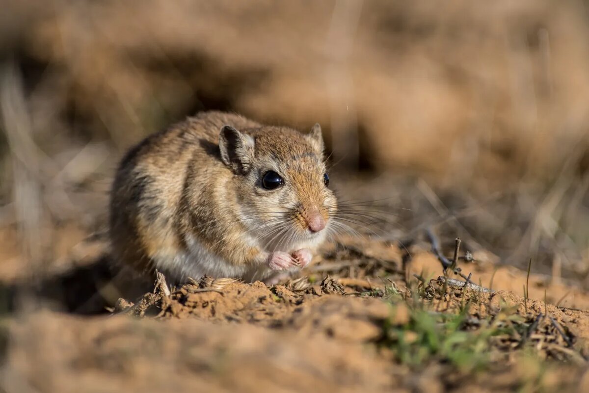 Сегодня мы расскажем о полуденной песчанке, совсем небольшом, но очень обаятельном зверьке, обитающем в Астраханской области. Этот грызун размером с обычную полевую мышь, но за счет интересной расцветки и крупных темных глаз он гораздо более интересен и фотогеничен. Полуденная песчанка – один из самых мелких представителей этого подсемейства отряда грызунов. Все песчанки имеют хорошо заметный пушистый хвост и более длинные задние ноги, которые позволяют им передвигаться прыжками. Благодаря этому песчанки немного напоминают других мелких грызунов, тушканчиков. Еще полуденная песчанка отличается большими темными глазами, которые сразу подсказывают, что животное хорошо видит в темное время суток, при недостаточном освещении. И действительно, она не зря получила это название, из норы песчанка обычно выходит во второй половине дня, почему я раньше ее очень редко встречал. Снизу туловище полуденной песчанки светлое, почти белое. Когда зверек сидит, прижа