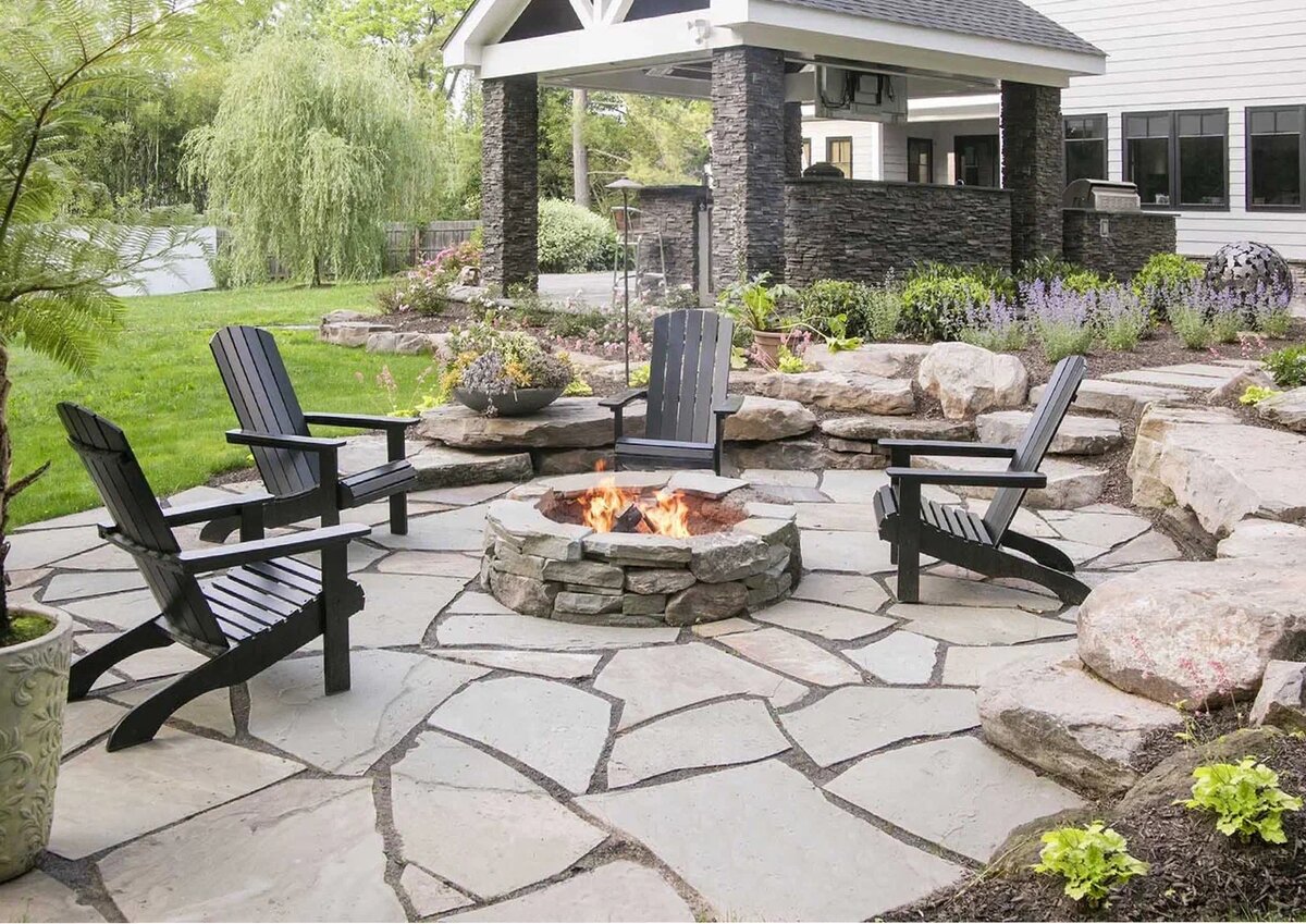 Наши клиенты, обладающие обширными участками, за последние два года стали строить отдельно уличный очаг и барбекю с беседкой. Тем же, у кого "королевство" не позволяет разгуляться, мы предлагаем объединить приготовление шашлыка и других полезных блюд с кострищем. И в качестве решения этой задачи прекрасно подойдет очаг из натурального камня. Что нам понадобится: для очага: для площадки вокруг: Этапы работ: Можно сам очаг делать из песчанника меньшей толщины, но тогда больше уйдет скрепляющего раствора. На рисунке внутри каменной кладки есть железное кольцо - в данном случае поступление кислорода практически сведено к минимуму. Это неудачный вариант. Можно использовать крупные камни разной формы - это выглядит очень природно. Если на вашем участке имеется перепад высот - можно построить небольшую подпорную стенку из того же камня, что и для мощения. О технологии строительства подпорных стен читайте тут. На площадке с мощением природным камнем можно установить очаг из другого материала -