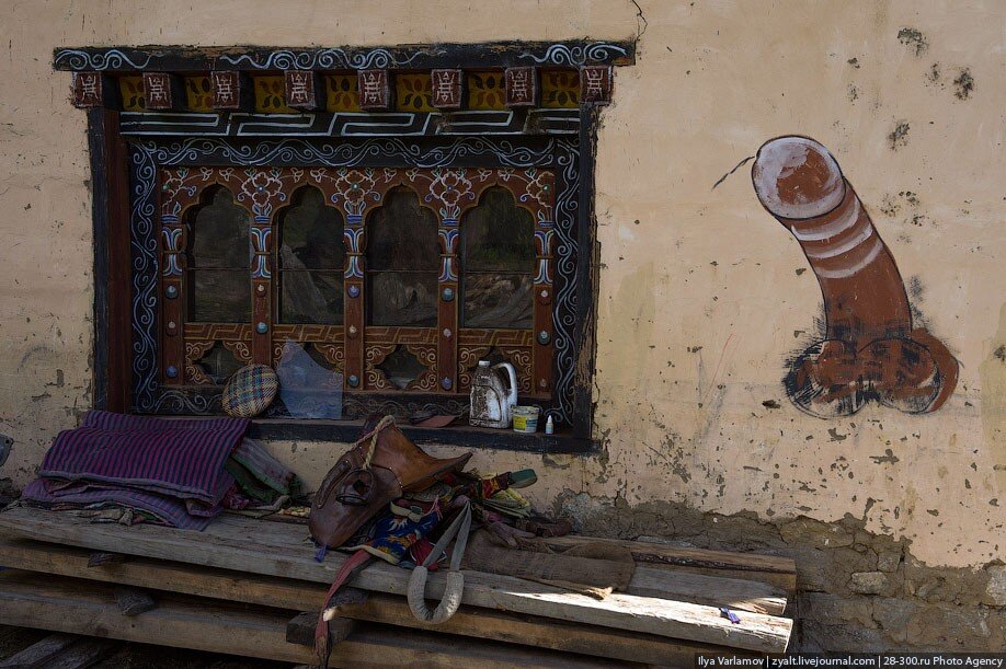 12. Главный туристический символ бутана - пенис на стене. Давным-давно Лама засунул свой пенис в рот злому духу, вследствие чего он задохнулся и умер. Лама, также известный как Святой Сумасшедший, наказал Бутанцам рисовать его эрегированный фалос на своих домах, чтобы отпугивать других злых духов. Случилась эта история в конце 14-го века, но живопись живет и сегодня.