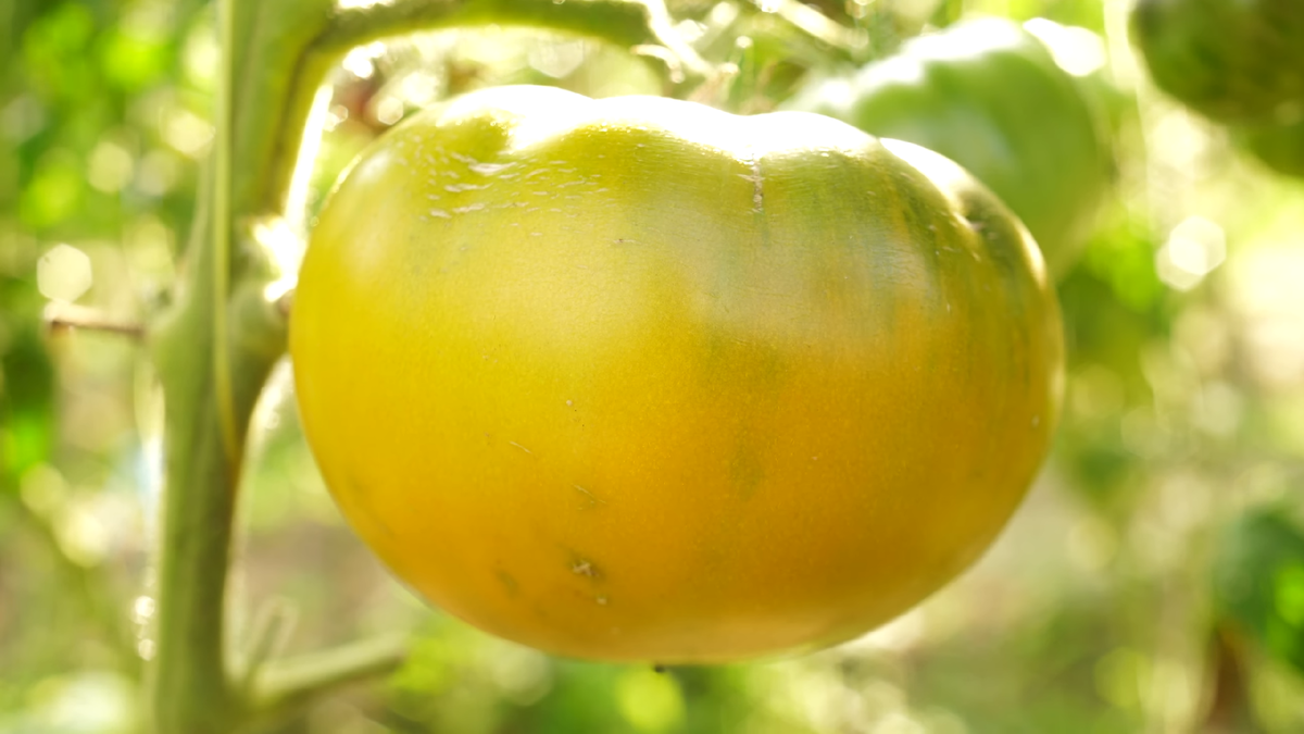 Сорт крупноплодный. Я полюбил его буквально на эмоциональном уровне. Во-первых, это сорт томата с картофельным листом. А такие листья, когда мы говорим по томатных гномах, смотрятся особенно красиво. Во-вторых, это, конечно же, необычный цвет плодов – он не жёлтый, но и не зелёный. Он где-то посередине и этим отличается от многих других сортов.