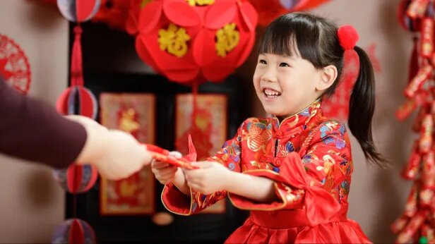 Одним из самых трогательных моментов является утреннее поздравление детей своих родителей с Новым годом, в ходе которого они выражают пожелания здоровья и счастья. В ответ родители благословляют детей, желая им успехов в будущем, и дарят красные конверты (hóngbāo) с деньгами. Этот обычай символизирует передачу удачи и благополучия от старшего поколения к младшему.