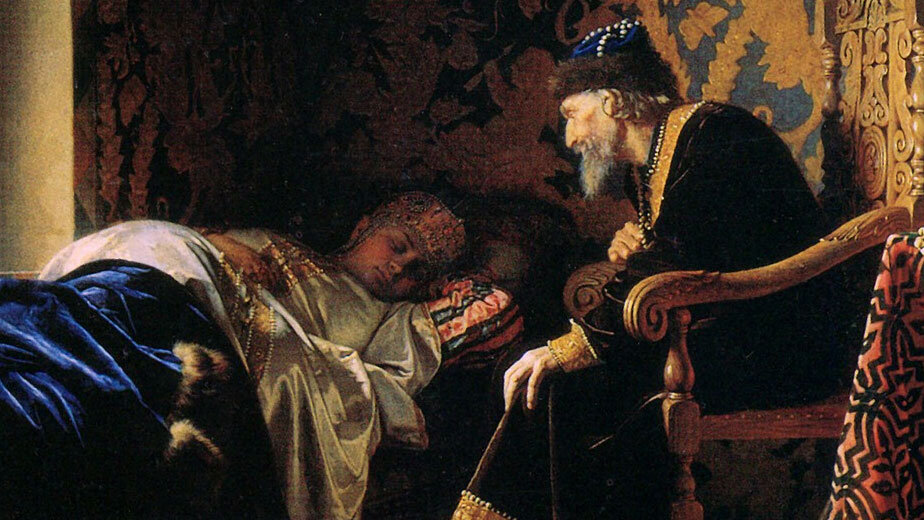 В это время к отцу вбежал сын Иван и стал просить не избивать его супруги, но этим только обратил на себя гнев и удары отца. Он был очень тяжело ранен в голову, почти в висок, этим же самым посохом. Перед этим в гневе на отца сын горячо укорял его в следующих словах: