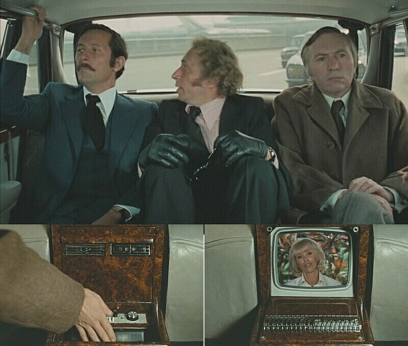 Сегодня видеоэкран в автомобиле – привычная опция. Навигация, камеры обзора, просмотр видео – или телевизионных передач. Но ещё совсем недавно (по историческим меркам, ха-ха) видео в автомобиле было как минимум невероятной экзотикой, если не фантастикой. И если в фильмах про Фантомаса (1964-1967) автомобильный телевизор еще был частью фантастического антуража (грубый монтаж виден невооруженным глазом), то в фильме «Возвращение высокого блондина» (1974) автомобильная видеодвойка – уже штатное оборудование (пока, правда, только в лимузине секретной службы). Уже в середине 50-х годов прошлого века контрольные видеомониторы появились в передвижных телевизионных студиях. Комплект аппаратуры тех лет помещался в автобусе, но это мелочи. Развитие электроники шло быстро, появление малогабаритной видеотехники было не за горами. Первые телевизоры, пригодные для использования в обычном автомобиле, были выпущены японскими фирмами уже в середине 60-х. Правда, это были монохромные («чёрно-белые») мод