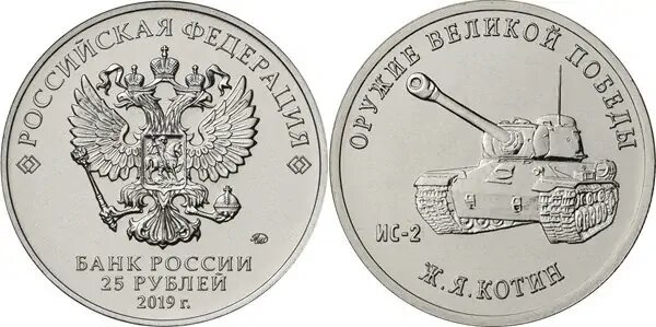 "25 рублей ИС-2 (Ж.Я. Котин)". Материал: медно-никелевый сплав. Тираж: 1 000 000 шт. Вес: 10 гр. Диаметр: 27 мм. Датировка: 2019 год.