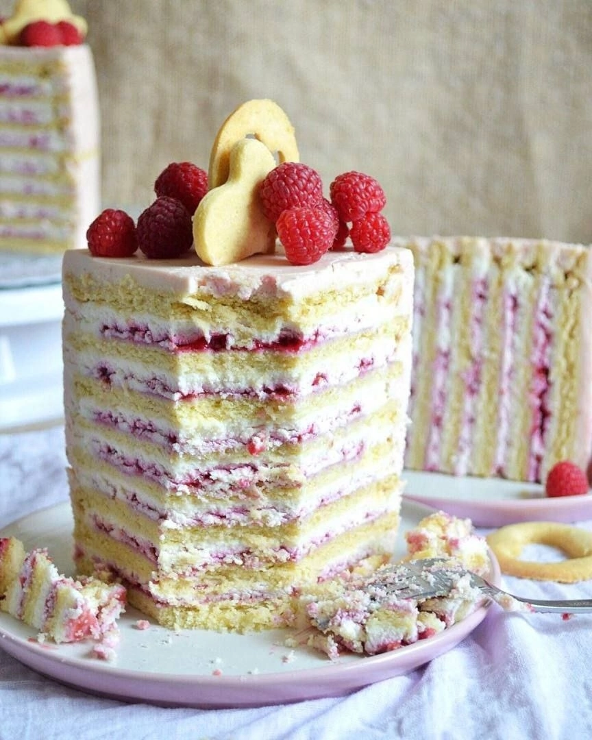 Коржи: -450 гр муки -200 гр масла 82,5% -1 яйцо категории С0(60-65 гр) -100 гр сахара -5 гр соды -1/3 соли -щепотка ванилина Приготовление: Масло комнатной температуры пробить блендером с сахаром, затем поместить масляную массу в чашу миксера, добавить яйцо, взбить (до однородной массы), добавить соль, ванилин, взбить. Далее поменять венчик на насадку крюк, если таковой не имеется-вымешивать лопаткой. Просеять муку с содой, добавить к масляной массе, перемешать на средней скорости до образования «комков». Далее руками соединить тесто в шар (немного вымешать тесто руками) завернуть в пищевую пленку и отправить в холодильник на 15 мин. Духовку разогреть до 190 гр, готовое тесто поделить на кусочки по 130 гр для формы диаметром 18 см. Раскатать корж через пергамент на пергаменте, с помощью кольца сформировать ровный корж, наколоть вилкой и выпекать 4-5 мин, до легкого золотистого цвета. Я выпекала в два уровня, 4 коржа на режиме конвекция/верх/низ. 🌿Малиновый соус: -170 гр свежей