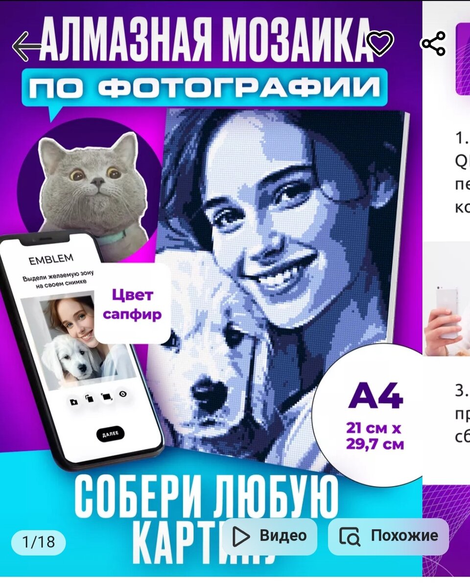 У меня появилось новое хобби - алмазная мозайка. Первые картины покупала в фикс прайсе, они там маленькие квадратные. Купила сначала чтобы в поезде было чем заниматься. Но так и не доделала. Чуть позже уже когда жила в Анапе, по вечерам было много свободного времени, и я вспомнила про картину. Так я и залипла на них. Сначала маленькие, потом купила побольше. Теперь вообще на Вб заказала три штуки: одна из них по фотографии. Можно скачать приложение, добавить туда любое фото и тебе дают схему. Мозайка продаётся в 4 цветах. Я выбрала синюю, мне кажется она поинтереснее выглядит. Так что буду тренировать в себе усидчивость😺.
