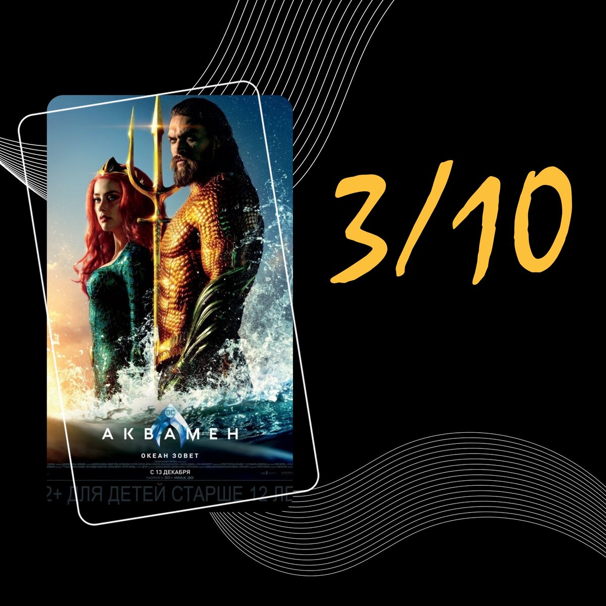 США, 2018, фэнтези, боевик, 12+ История получеловека-полуатланта Артура Карри, которому предстоит выяснить, достоин ли он быть тем, кем ему суждено по рождению — царём подводного мира. Начнём с того, что я не люблю фильмы от компании DC, у них слишком нудное кино выходит, который даже не захватывает дух. Но всё же, у данной компании есть и свои зрители. Мне понравилось совсем малая часть, из того, что у них выходило. "Аквамена" я смотрел в момент выхода в цифровом релизе, он меня разочаровал, и я решил пересмотреть заново, т.к вышла 2 часть. Не интересные персонажи второго плана, а точнее, их игра. Отмечу одного актёра который больше всего не понравился- это Патрик Уилсон, ему эта роль никак не идёт. Да, в этой картине крутая и мощная графика, всё сделано на высшем уровне, но сюжет топчат на одном месте, а также отсутсвует динамика. На счёт саунтрека, он не вызвает никаких эмоций и подобран совершенно неуместно. По поводу костюмов. Прекрасный наряд у главного героя Аквамена и