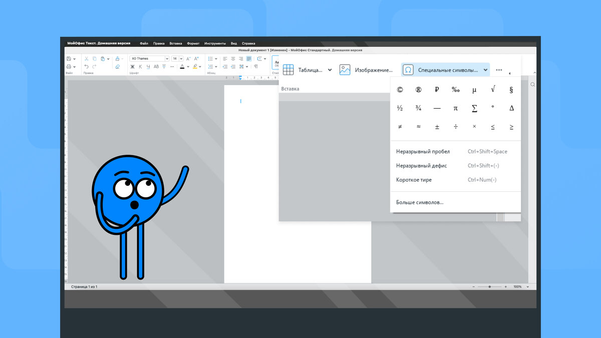 Вот некоторые из специальных знаков, доступных в МойОфис:
