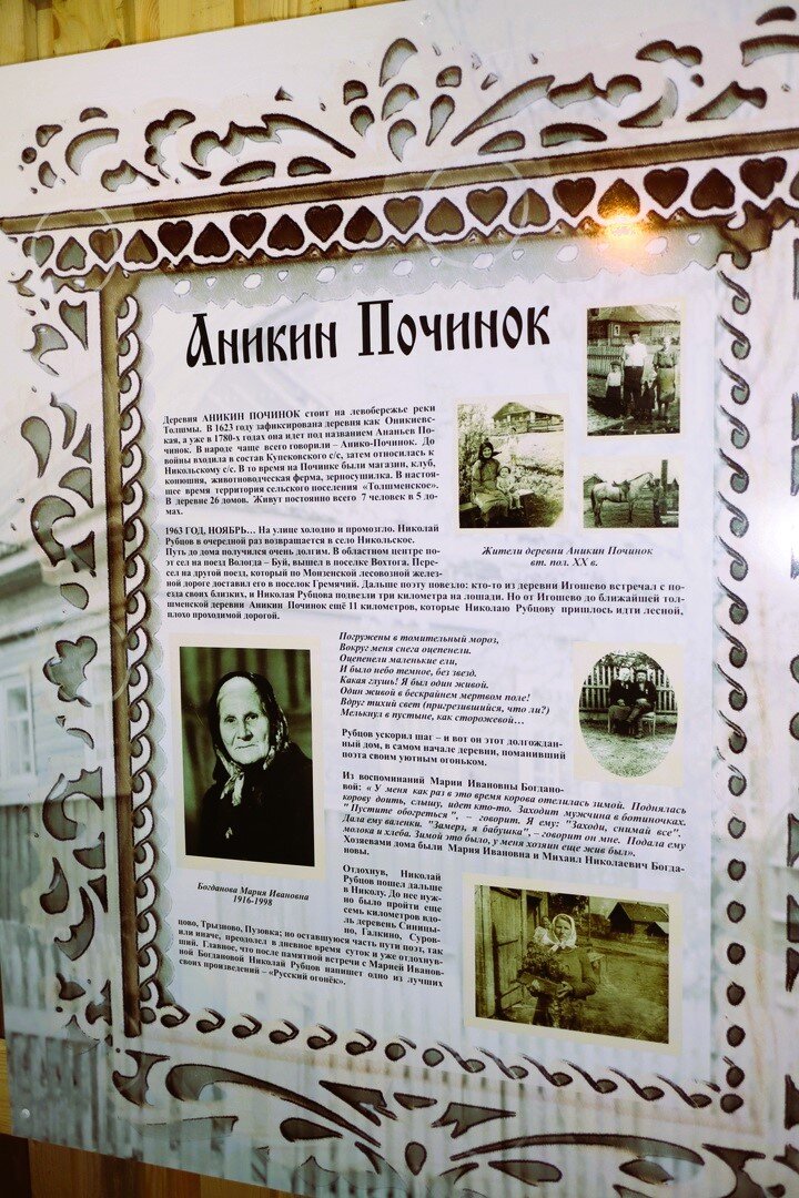Виктор Рубцов Аникин Починок. Музей в деревне из семи жителей Осенью 1966 года в общежитии Донецкого политехникума воспитатель приобщал нас к поэзии, дав полистать журнал «Юность» (1966, № 6) со стихотворением Николая Рубцова «В горнице». Но мы не очень-то и клюнули. Нам было всего по 16–17 лет, и поэта Рубцова никто в нашем окружении не знал. Юные головы были обильно запудрены «Книгой любви» Василия Фёдорова: «Я не знаю сам, Что делаю… Красота твоя, — Спроси ее. Ослепили Груди белые, До безумия красивые...» А у воспитателя, присланного нам из Черкасской глубинки за Днепром, были свои кумиры, розмовлявшие на мове. Я один обратил внимание на поэта только лишь потому, что однофамилец. Его известность, популярность и слава были далеко-далеко впереди. А что было, пока мы оканчивали восьмилетки и поступали в колледжи, именуемые тогда техникумами, а нам известные под кличкой «технари»? А было вот что. Николай Рубцов был студентом московского литературного института. И в конце ноября 1963 го