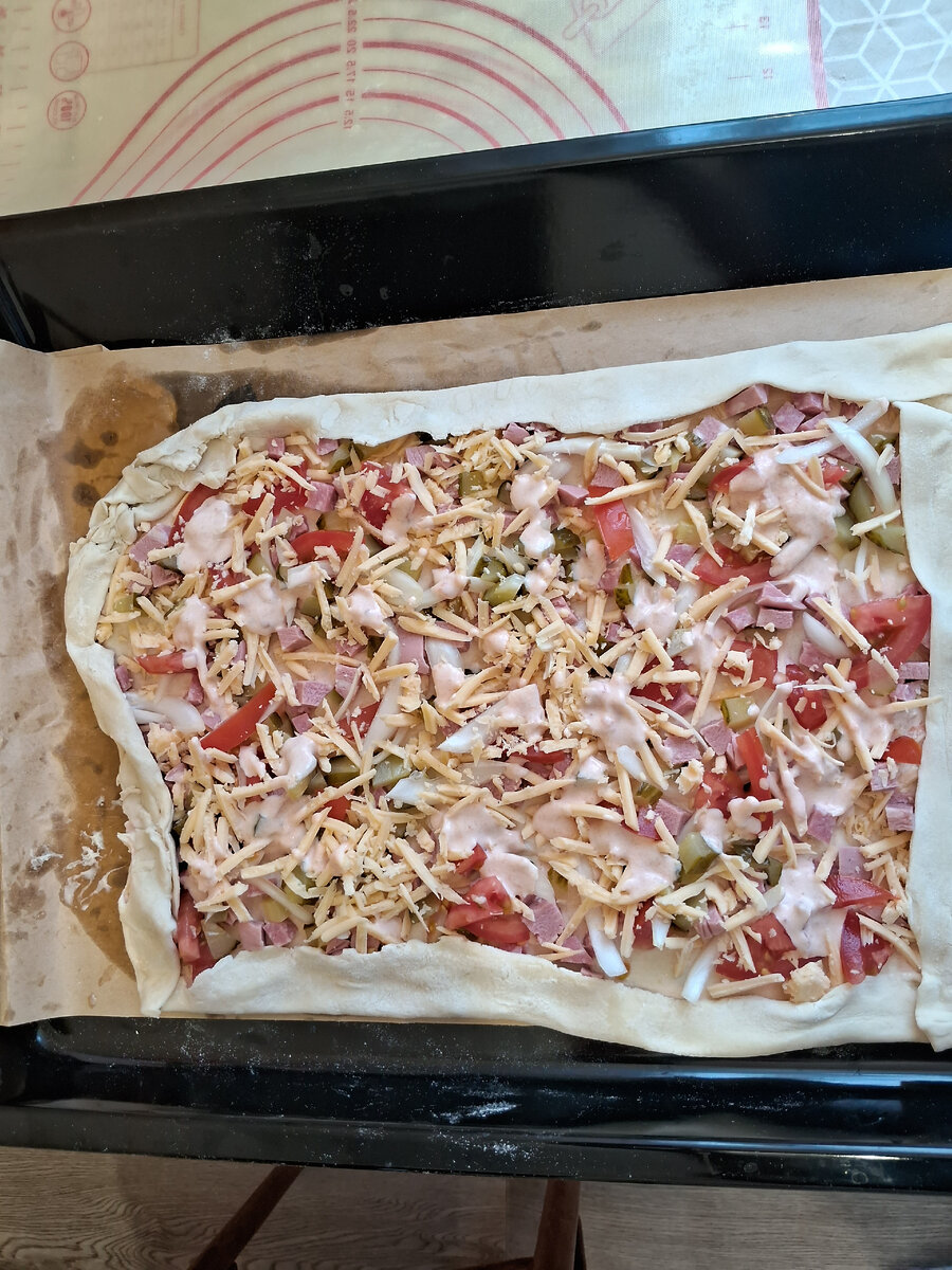 Сегодня испекла пиццу и решила поделиться рецептом. Берем слоеное бездрожжевое тесто, раскатываем его в тонкий пласт. Накрываем протвинь пергаментной бумагой. Смазываем бумагу растительным маслом и кладем туда тесто. Смазываем тесто соусом из майонеза и томатной пасты. Затем выкладываем на пиццу продукты. У меня это колбаса нарезаная кубиками, помидор, соленый огурец, лук колечками и сверху посыпаем тертым сыром и выкладываем остатки соуса. Подворачиваем края у теста. Ставим протвинь в духовку на 20-30 минут разогретую на 180 градусов. После того как сложили все ингридиенты отправляем пиццу в духовку на 20 минут температура 180 гр. Пицца готова, выглядит аппетитно. Начинку можно использовать любую, смотря что у вас есть в холодильнике. Ингридиенты для пиццы: -Слоеное тесто бездрожжевое -Майонез -Томатная паста - Растительное масло -Колбаса (любая) -Помидор -Соленый огурец -Лук -Сыр