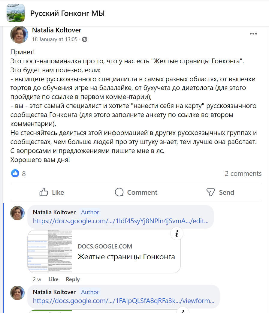 В фейсбук группе про Гонконг, Наталья - создатель Желтых страниц Гонконга выложила пост. Там две ссылки. Одна - таблица с информацией про соотечественников, которые предлагают различные услуги в Гонконге.
