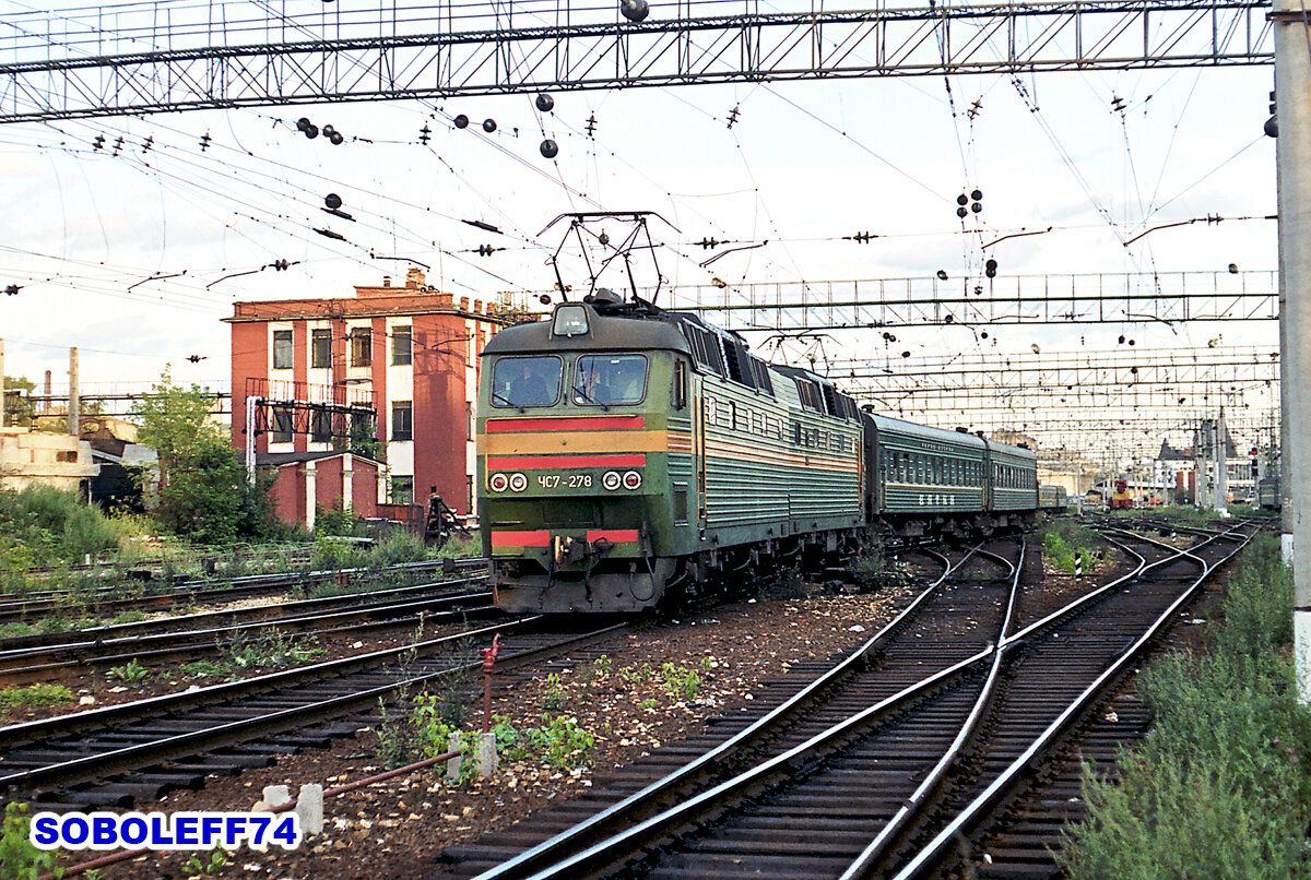 Электровоз ЧС7-278 со скорым поездом "Вятка" Москва - Киров. Станция Москва-Ярославская Московской железной дороги. Июль 1995 года. Когда поезда ещё были зелёными. "Вятка" с тех пор успела побывать трёхцветной и дважды сменить вокзал в Москве. Каким номером она ходила в 1995 году уже не помню. Но, вроде, 17/18. Если ошибаюсь, поправьте. Сейчас и электровоз, и поезд живы. Но, выглядят уже не так. Тепловоз 2ТЭ116-068 с грузовым поездом. Перегон Броневая - Предпортовая Октябрьской железной дороги. Июль 2015 года. Ещё один пример, как выглядел поезд здорового человека. Обычный поезд. С обычным "фантомасом". Только, очень старым. И уже списанным. Электропоезд ЭД4М-0330. Платформа Карачарово (перегон Москва-Пассажирская-Курская - Кусково) Московской железной дороги. Октябрь 2010 года. Ныне не существующая окраска электропоездов, планировавшаяся как фирменная для Горьковского хода. Ныне не существующая тихая уютная платформа, на месте которой выросла станция Нижегородская. Электропоезд ЭМ2-