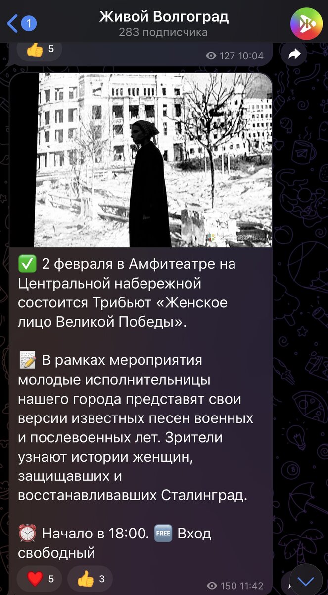 Вот такой пост накануне мне прислали друзья: Это был пост одного городского паблика, а фото к нему - по невежеству, кадр из спектакля, в котором я играла в 2018 году! Мы пошутили, что скоро этот кадр будут использовать как реальные фото 1940-х 😅 Но мне так захотелось пересмотреть тот спектакль, тем более дата подходящая: 2 февраля в Волгограде всегда праздник! Спектакль, где я сыграла одну из главных ролей, назывался «Белое платье», а его слоган - «Раз бабы решили - Сталинград будет жить!». Постановка рассказывает о подвиге коммунальщиков, которые восстановили водопровод всего за три месяца после победы в Сталинградской битве. Пьеса насыщена малоизвестными историческими подробностями. В повествование органично вплетены фрагменты воспоминаний, писем и документов. Тогда я сыграла роль Александры Черкасовой - лидера добровольческого движения по восстановлению Сталинграда. Да, в честь неё я назвала свою дочь :) очень уж много воспоминаний осталось о репетициях, премьере, да и сама Ч