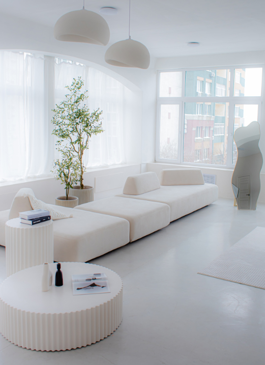 Большой модульный диван (на колёсах, форма дивана зависит от вашей фантазии) Арки и тканевые фоны Геометричные и фактурные стены 6 больших окон 2 источника импульсного света и 1 постоянного
