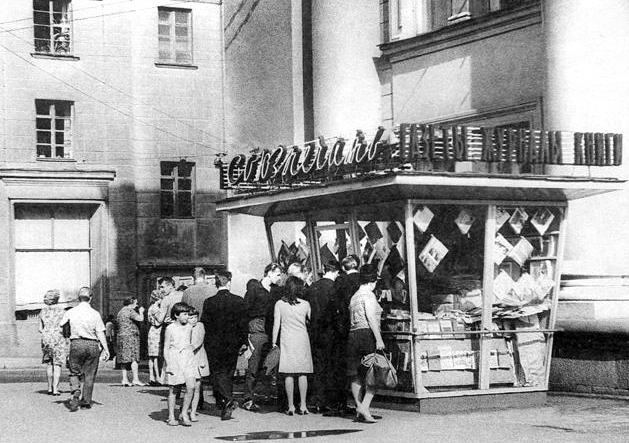 В разных городах СССР были распространены киоски "Союзпечати". С 60-е по 80-е годы они открывались буквально повсюду. Удобно, можно было купить газетёнку утром, чтобы почитать в перерыв, или заглянуть на прилавок после работы. Подобные киоски устанавливали обязательно возле остановок общественного транспорта, возле вокзалов и рынков. В таких "точках" товар пользовался особым спросом. Было такое расхожее мнение: очень выгодно дружить с киоскерами, если ты книголюб. Тогда они не выкладывали на прилавок товар, а оставляли для тебя редкие книжки, которые привозили в двух — трёх экземплярах. При СССР одним из основных источников информации для населения была газета "Правда". Но, несмотря на ее популярность, многие люди сомневались в достоверности печатных сведений. Ведь часто случалось так, что написанное в газете не соответствовало реальности. Газета "Правда" была официальным органом ЦК КПСС, поэтому ее содержание строго контролировалось. Из-за этого реальные события в ней редко освещались