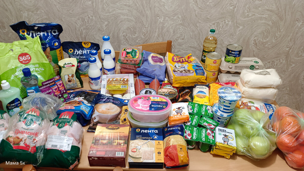 Как обычно перед выходными делаем закупку продуктов на неделю . Бюджет недельной закупки 10000 рублей включая бытовую химию . Покупала продукты в этот раз в гипермаркете Лента. Не было возможности ездить по разным магазинам (часто так с мужем закупаем). Продуктовая корзина на неделю на семь человек.(плюс две кошки и кролик) Мясо и мясные продукты : 1. Говядина 1 кг. - 689 рублей 2. Курица тушки (общий вес 6,5 кг) - 1378 рублей (за 1 кг 211.51руб) 3. Сосиски МК Великолукский Детям 4 пачки по 111 рублей . 4. Колбаса Папа Может "Финский сервилат" 2 штуки по 151 руб. Молочная продукция : 1. Молоко стерилизованное Славянские традиции (брала первый раз-понравилось) 10 пачек по 73.32 за штуку 2. Сметана Простоквашино 15% 2 пачки по 68 рублей 3. Кефир Вкусняев 2,5% 1 бутылка за 76 рублей . 4. Ацидофилин Вкусняев 3 бутылки по 56 рублей . 5. Творог ОченьВажнаяКорова 5% 3 пачки по 68 рублей . 6. Масло сливочное ОченьВажнаяКорова 72,5% 3 пачки по 120 рублей . 7. Йогурт Актибио 6 штук по 36 ру
