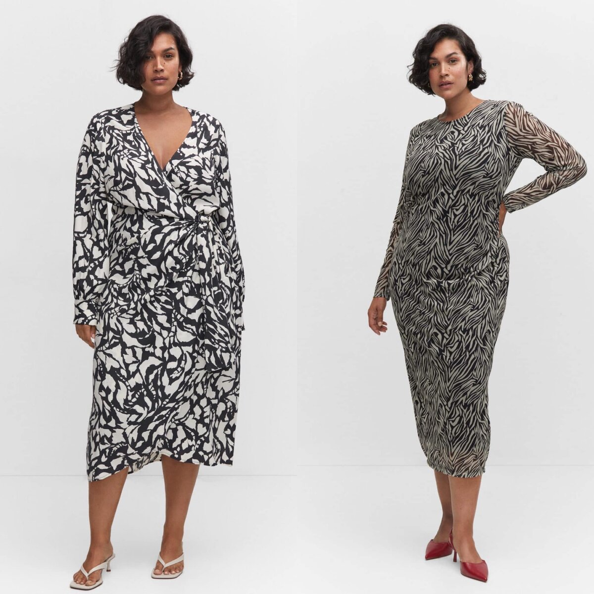 Я только прочла книгу где говорилось, что чем девушкам размера чуть больше, чем s, лучше выбирать крупный принт. Но мы наглядно увидели на фото , что в платье справа , девушка выглядит более изящней. Конечно здесь играет роль и крой платья , но казалось бы совсем неподходящий силуэт для уменьшения фигуры, и принт мельче чем нужно, уж точно покажет фигуру в невыгодном свете, но нет… Чаще всего можно услышать мысли, что однотонные вещи смотрятся на фигуре лучше, так как делают ее стройней, но сравнивая два платья, мы видим как в принте сразу уменьшились бедра, исчез животик, ну и когда зона декольте открыта- всегда силуэт воспринимается легче. А если сравнить зеленое платье с зеброй , то можно сделать фото в стиле «до/ после» и рекомендовать свою систему похудения. Максимально приближенные платья. И снова мне больше нравится с рисунком. Как ни странно оно делает фигуру легче .
