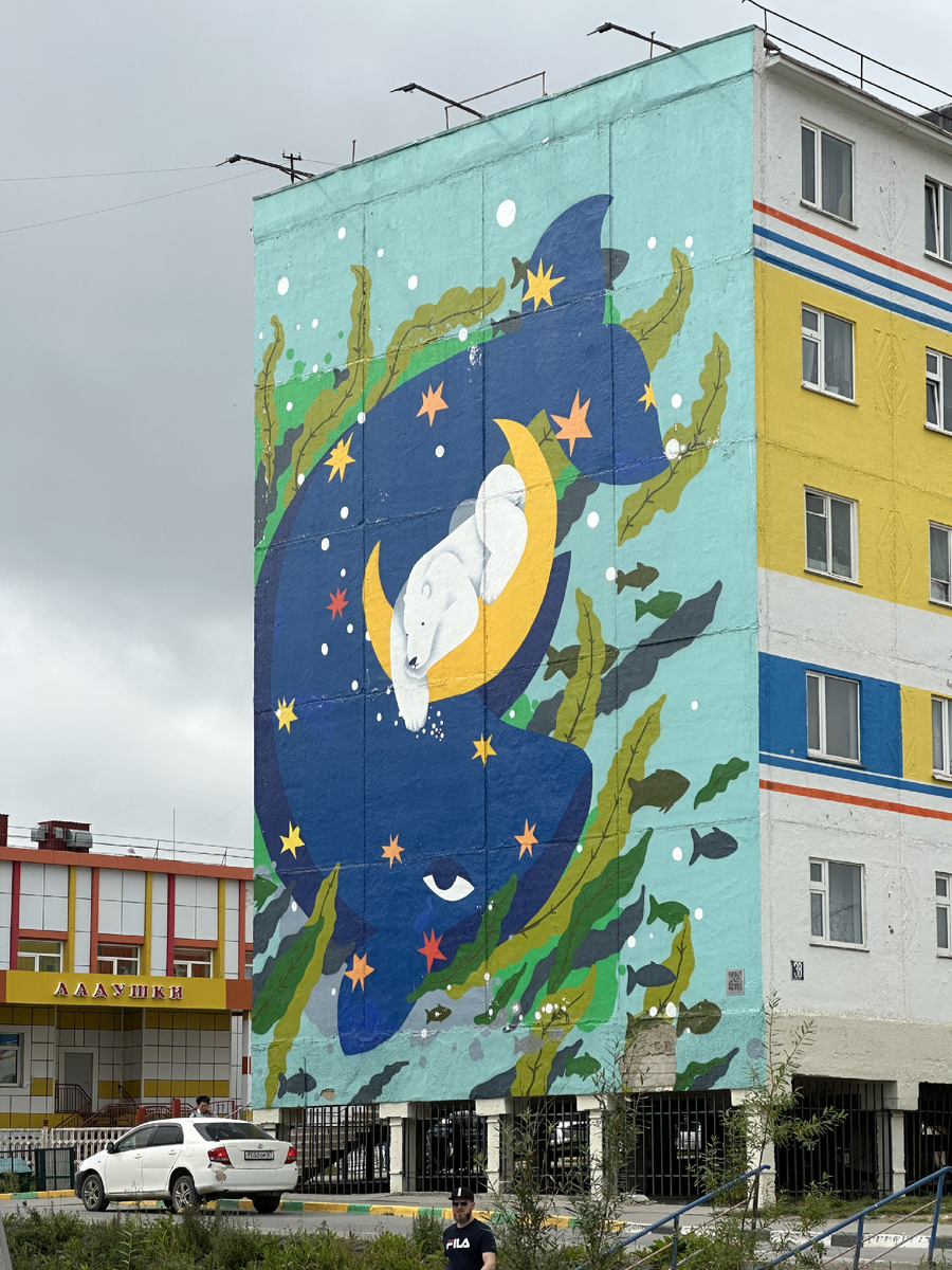 Огромные, яркие, настраивающие на позитив картины добавили Анадырю индивидуальности. Пройдемся и посмотрим муралы Чукотки? Наши фавориты — белый медвед и чудные киты.