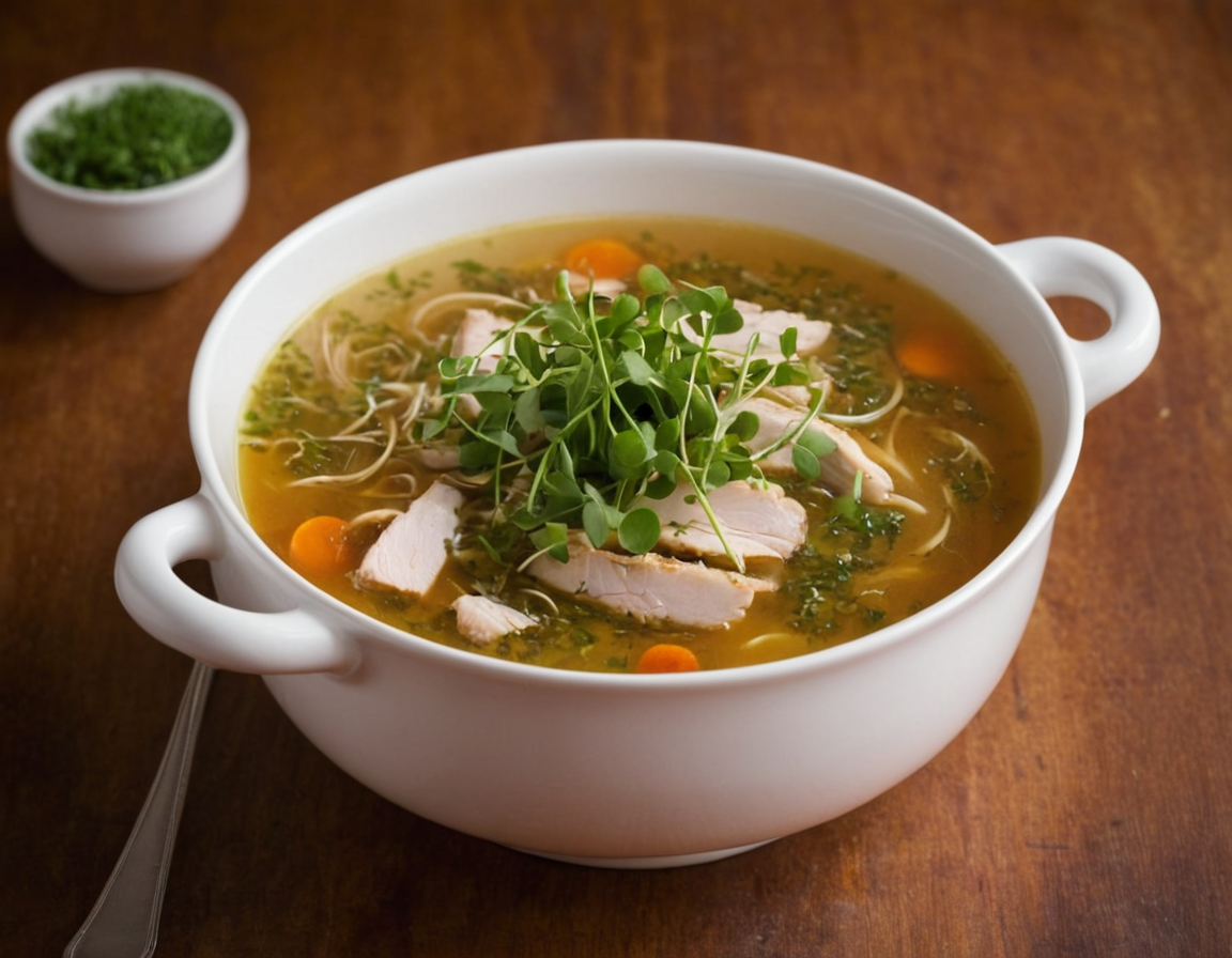 - Приготовление: Обжарьте лук, добавьте куриное филе, нарезанную морковь и картошку. Залейте куриным бульоном, варите до готовности. Добавьте микрозелень перед подачей. 🍵🌿