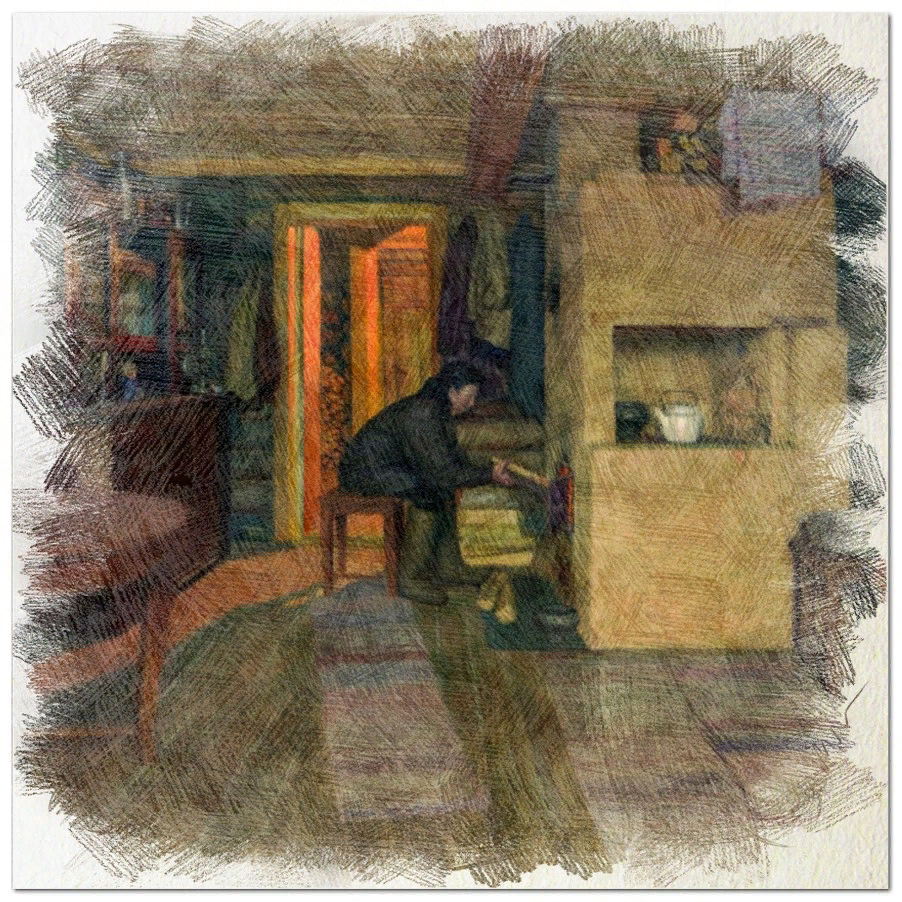 Наконец, подкрались нешуточные морозы. Деревья покрылись инеем, а окна разрисованы узорами, как из сказки. Старый дом начал промерзать. Пол ледяной, по углам изморозь. Татьяна Васильевна беспрестанно топит печь, пытаясь натопить сильнее. Пожилому человеку хочется тепла, ведь ноют натруженные руки и ноги.