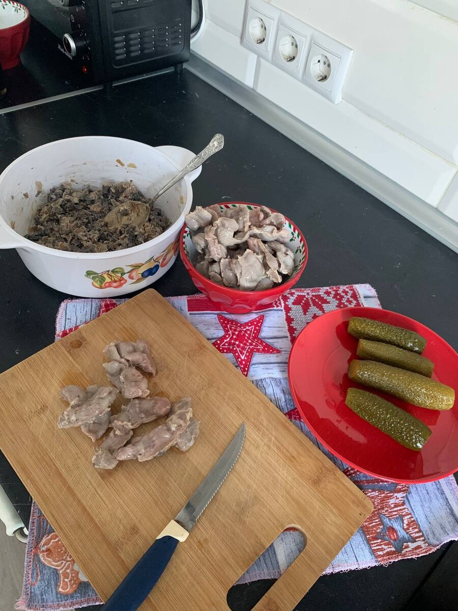 Привет, друзья! На Рождество готовлю только лучшее. Этот салат действительно хорош! В этот раз использовала одну интересную фишку. Так как у меня не было языка для этого салата, решила использовать куриные желудки, которые по вкусу очень похожи. И не прогадала. Получилось очень вкусно. Возьмите на вооружение, хорошая замена. Итак, нам понадобятся 400 г шампиньонов, которые нарезаем пластинами и обжариваем на сухой сковороде, немного выпаривая. Пока горячие перекладываем в миску и смешиваем с 2 ст.л. майонеза. 400 г репчатого лука нарезаем соломкой и обжариваем в растительном масле. Добавляем его к грибам 400 г вареного языка или, как у меня, куриных желудков, и 400 г маринованных огурцов нарезаем тоже соломкой. Смешиваем все ингридиенты вместе Добавляем свежий укроп и майонез И оставляем в холодильнике на 2 часа настояться. Вот такая вкуснятина. Сытный, сочный,не сложный, очень рекомендую.