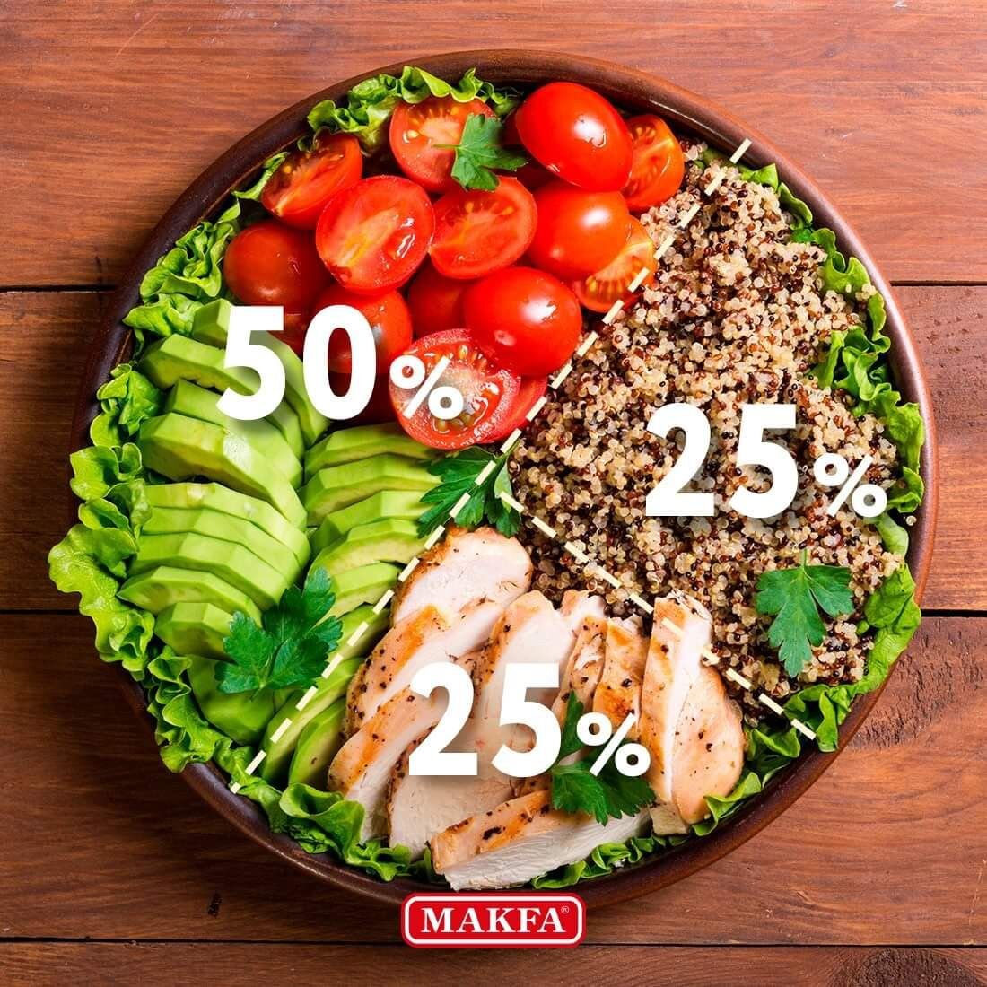 Правило тарелки заключается в том, что её мысленно делят на три части: 1я часть (25% тарелки) - занимают сложные углеводы. Углеводы – ключевой источник энергии в человеческом теле. Именно сложные углеводы являются самыми полезными. К ним относятся клетчатка, пищевые волокна, гликоген, крахмал в чистом виде. Главным преимуществом сложных углеводов является то, что они дольше обеспечивают чувство сытости и нужны для усвоения некоторых групп витаминов и минеральных веществ. 2я часть (25% тарелки ) - занимают белковые продукты, в основном, это мясо. Ни один из существующих живых организмов – от вирусов до растений и животных – не может существовать без белка. Основная функция белков – восстановление, рост, строительство и развитие организма. Почти все ферменты и некоторые гормоны имеют белковый состав. Белки активно участвуют в выработке антител и обеспечивают организму сильную и функциональную иммунную систему, а также участвуют в транспортировке многих соединений. Белки необходимы д