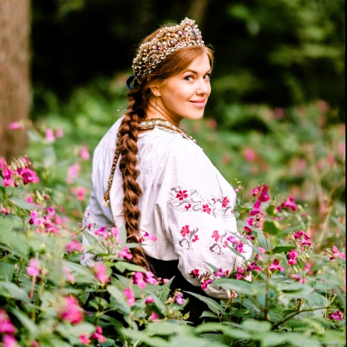Поднялся Семка и видит: по лугу девушка идет, песенки поет, нагибается и травку в корзинку складывает. Кто такая? В простом длинном сарафане, веночек на голове, тяжелая коса на грудь падает. Залюбовался парень девушкой, а уж Шарик вокруг нее так и прыгает, так и ластится. Поднялся он, от травы отряхнулся, улыбнулся, и на сердце его соловьи запели. А та увидела парня, и уж к нему идет.