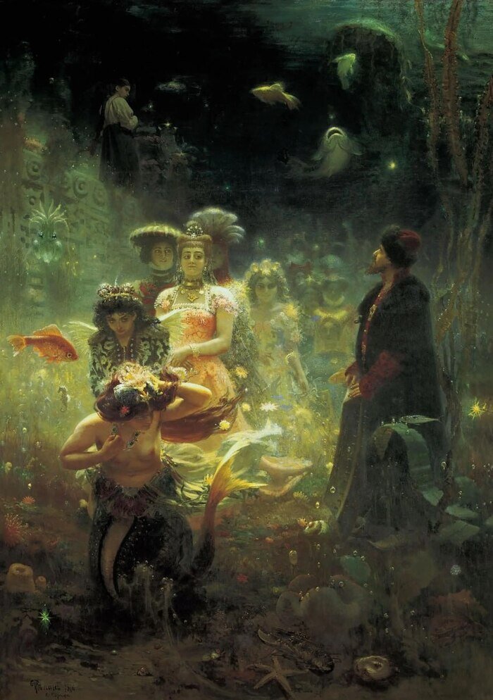 Илья Ефимович Репин -Садко" 1876. Картину «Садко» Репин написал в Париже. Получив Большую золотую медаль Академии художеств за картину «Воскрешение дочери Иаира», Репин получил право на пенсионерскую (то есть оплачиваемую Академией) поездку в Европу. Образ Садко написан с Виктора Васнецова, позже прославившегося в том числе в качестве автора сказочных сюжетов (и изобразившего своего "Садко"). Темой картины послужили новгородские былины о гусляре Садко, который разбогател при помощи морского царя. Его торговые корабли замерли посреди моря и, чтобы умилостивить морского владыку, Садко спустился на дно. На картине изображен момент, когда он по приказу морского царя выбирает себе жену в подводном царстве. Перед ним проходят роскошные красавицы, но по полученному от Миколы Можайского (впоследствии именуемого Николаем Чудотворцем) совету, Садко выберет простую русскую девушку Чернавку, которая видна в глубине картины. Чтобы создать волшебное пространство подводного царства, Репин осмотрел мо