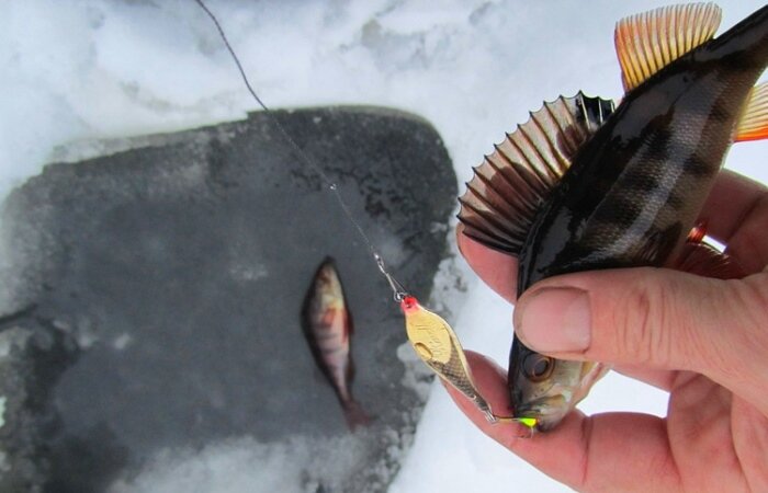 - Сильный мах. Окунь обычно находится в непосредственной близости от лунки, поэтому для его привлечения мах должен быть достаточно размашистым. Не стоит выполнять этот маневр прямо у дна, лучше повыше. Ваша цель - только привлечь окуня, заставить его двигаться в сторону вашей лунки.